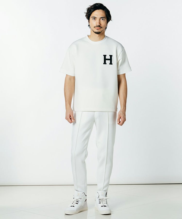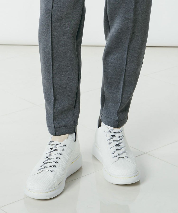 なめらかな手触りと独特の膨らみ感が特徴の、ダンボールニットを使用したパンツ。軽量でストレッチ性にも優れており、快適なはき心地を実現しました。 センタークリース入りのすっきりとしたテーパードシルエットで、ビジネスシーンにも上品な印象に。バックポケットにあしらったロゴ刺繍がさりげないアクセントになっています。