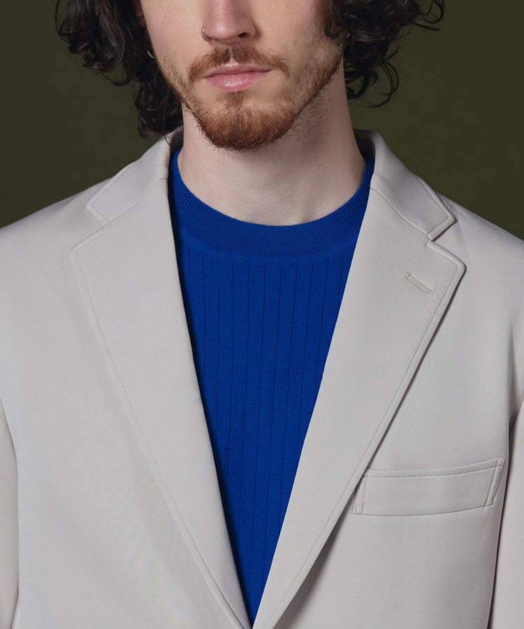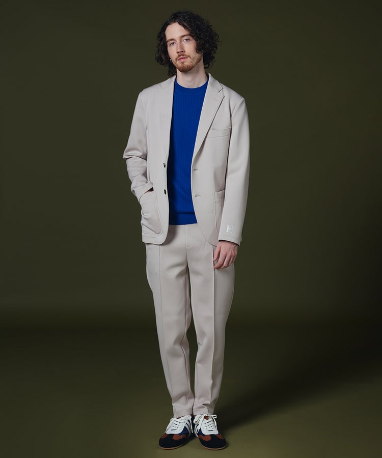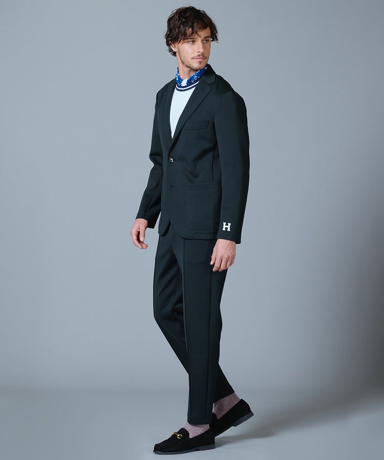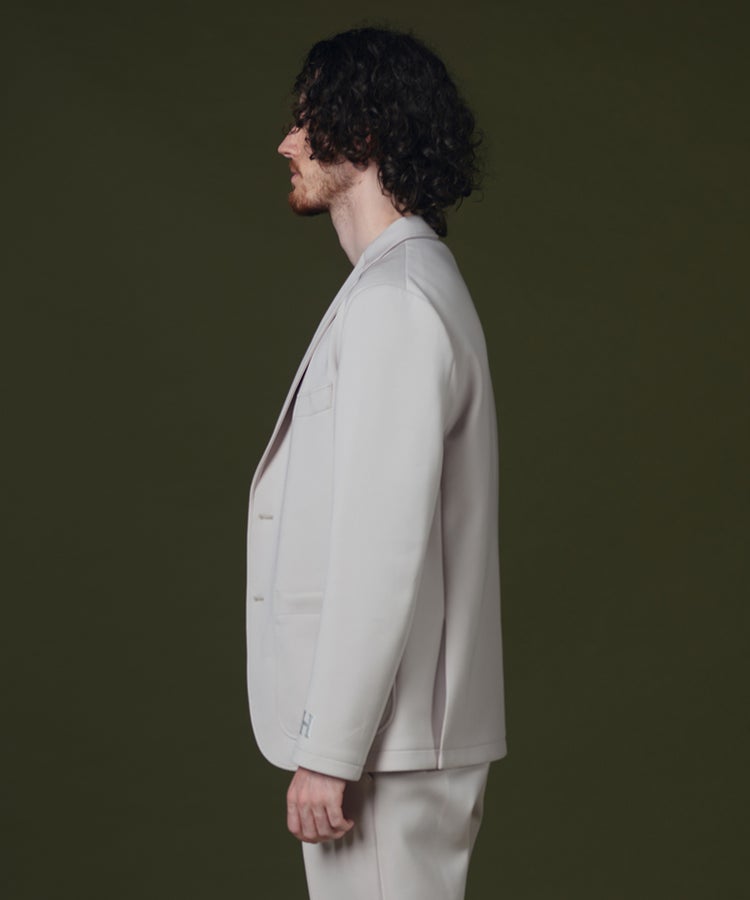 程よいハリとなめらかな風合いが魅力のスキューバニット素材で仕立てたテーラードジャケット。高い伸縮性を備え、動きやすく快適な着心地を実現しました。袖口にあしらった「H」のワンポイント刺繍がさりげないアクセントに。オンオフ問わず取り入れやすく、日常からビジネスシーンまで幅広く活躍します。