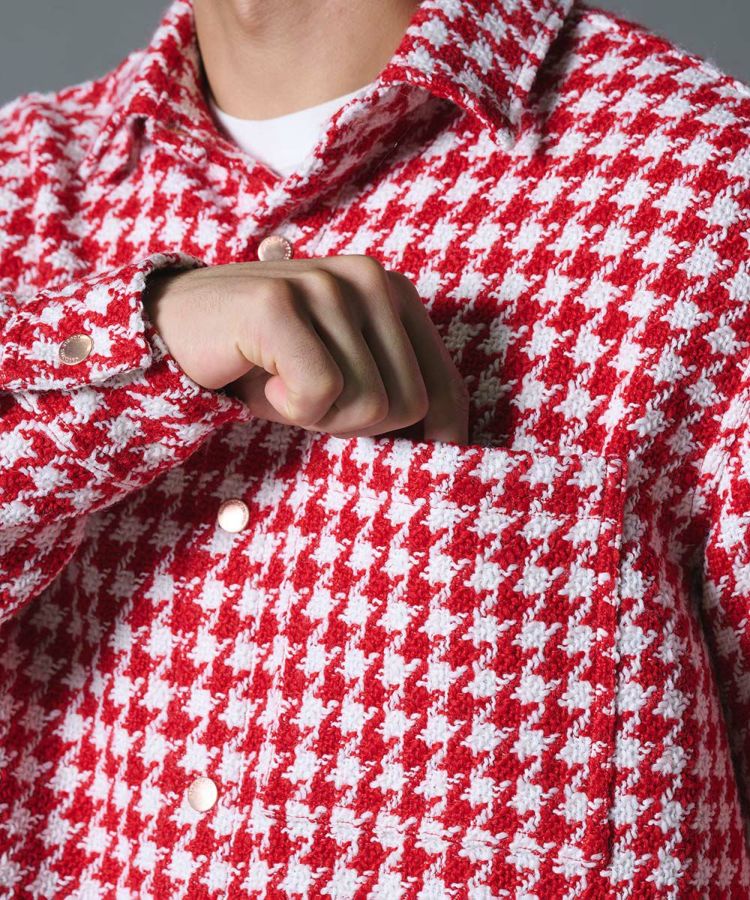 レッド×ホワイトの格子柄チェックが目を惹くブルゾン。ヴィンテージ感漂うツイード生地を使用し、軽やかに羽織れるシャツ感覚のアウターに仕上げました。裏地にはシャツ生地を採用しているため、快適な着心地も魅力。存在感抜群の主役級アイテムは、シンプルなボトムスと合わせるだけでスタイルが引き締まり、こなれた大人の装いを演出します。