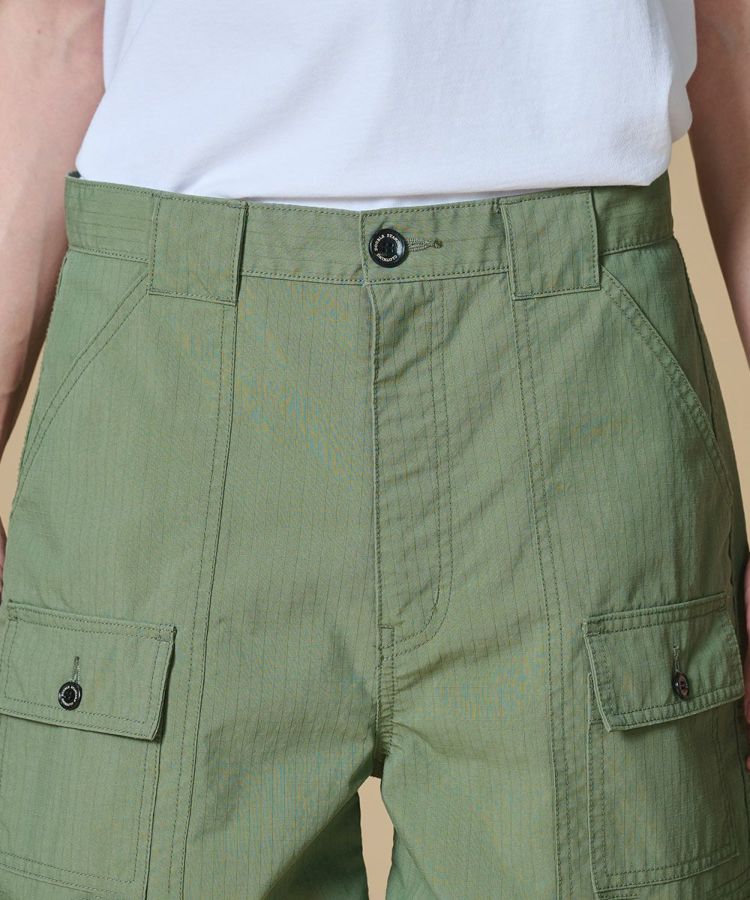 コーマ糸のオーガニックコットンとリサイクルナイロンを交織した、リップストップ生地を使用したカーゴパンツ。ゆったりとしたシルエットに大きめのポケットを配し、程よくカジュアルな表情に仕上げました。動きやすいショート丈で、アクティブなシーンにも活躍。同素材のジャケット(型番:0705130261)と合わせた、統一感のあるセットアップスタイルもおすすめです。