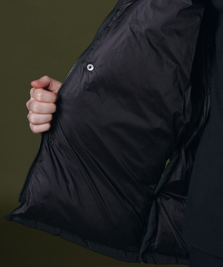 程よいボリューム感がありながらも、きれいなシルエットに仕上げたダウンジャケット。ボタンやジップも同色にすることでミニマムなデザインに。ダウンジャケットでもカジュアルになりすぎず、上品に着られるのが魅力です。また、フードだけでなく袖を取り外してダウンジレとして楽しむことができます。
