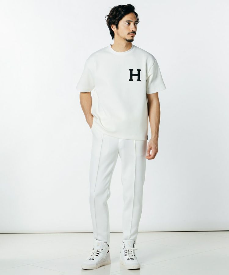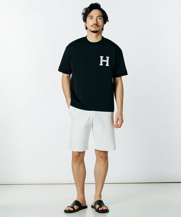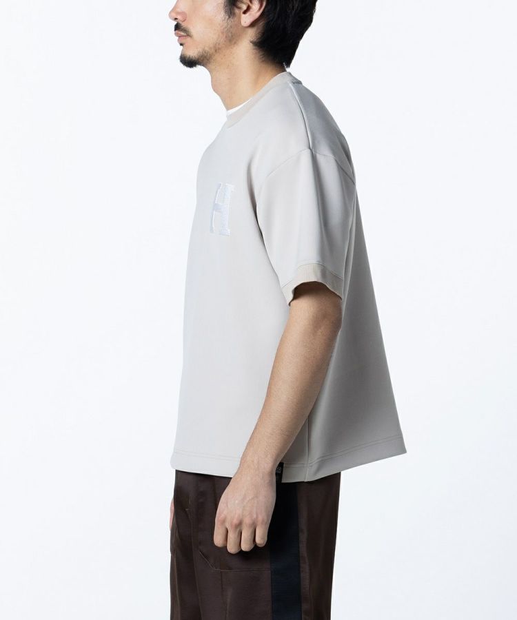 アイコンのHを胸元にあしらった半袖Tシャツ。シルクに最も近い合成繊維であるトリアセテートをハイテンションなPU混のダンボールニットに仕上げた生地を使用しています。完成された原料であるトリアセテートだからこその品のある風合いを活かした、まったく新しい高級ダンボールニット。なめらかな表面感と、柔らかな膨らみ感が落ち着いた印象を与えてくれます。