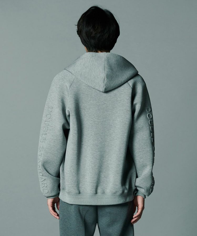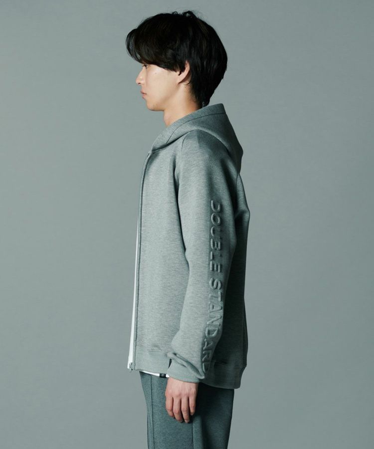しっかりとした落ち感のあるダンボール生地を使用したジップパーカー。型を起こし樹脂を流し込んで表現したこだわりの凹凸ロゴを袖にあしらい、唯一無二のポイントにしました。ゆったりとしたオーバーサイズシルエットで、さっとラフに羽織れる一枚。なめらかな表面感なのでカジュアルになりすぎず、上品な印象を与えてくれるのが魅力です。