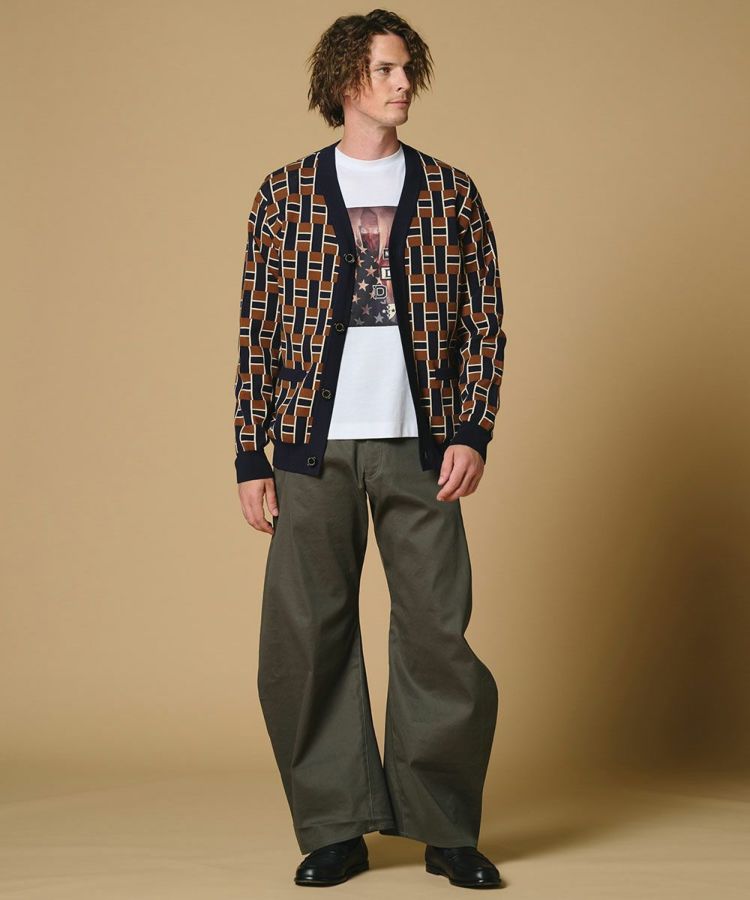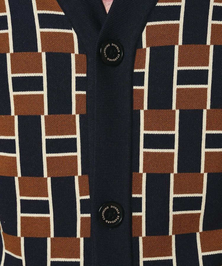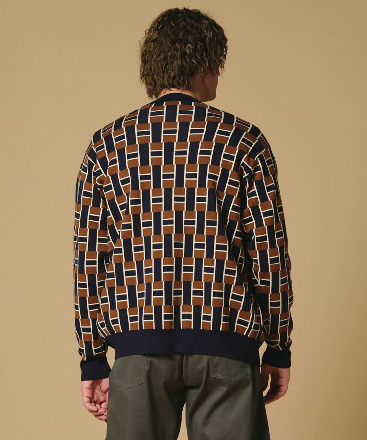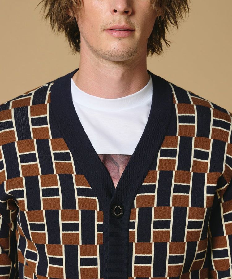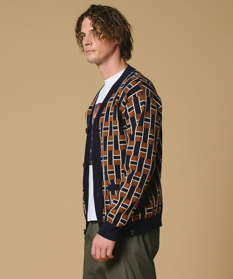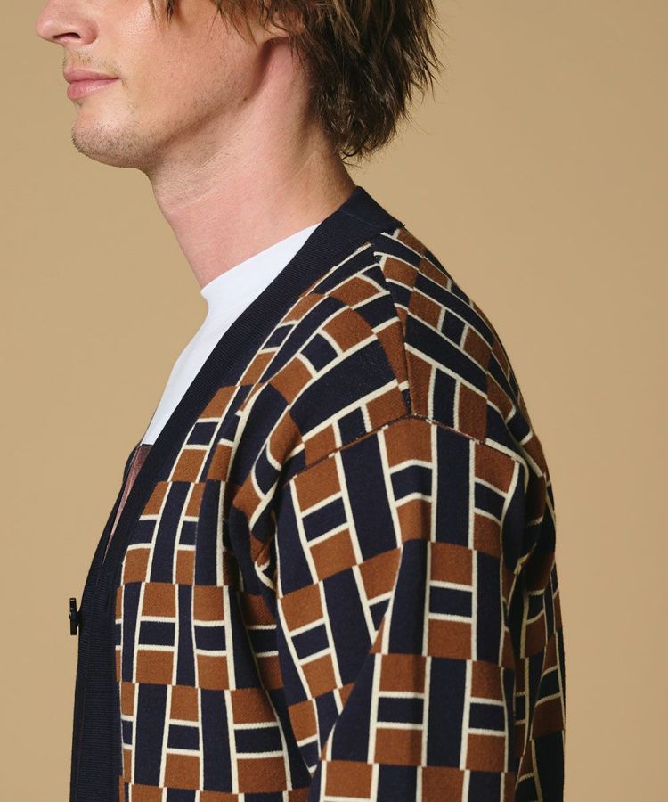 オリジナルの幾何学模様が目を惹くカーディガン。程よく立体感がありながら、さらりとした肌ざわりのジャガードニットを使用し、快適な着心地を実現しました。キャメル×ネイビーの配色がクラシカルな雰囲気をプラスし、シャツの上からサッと羽織るだけでスタイリングがぐっとこなれた印象に。大人のカジュアルスタイルに品よく映える一着です。