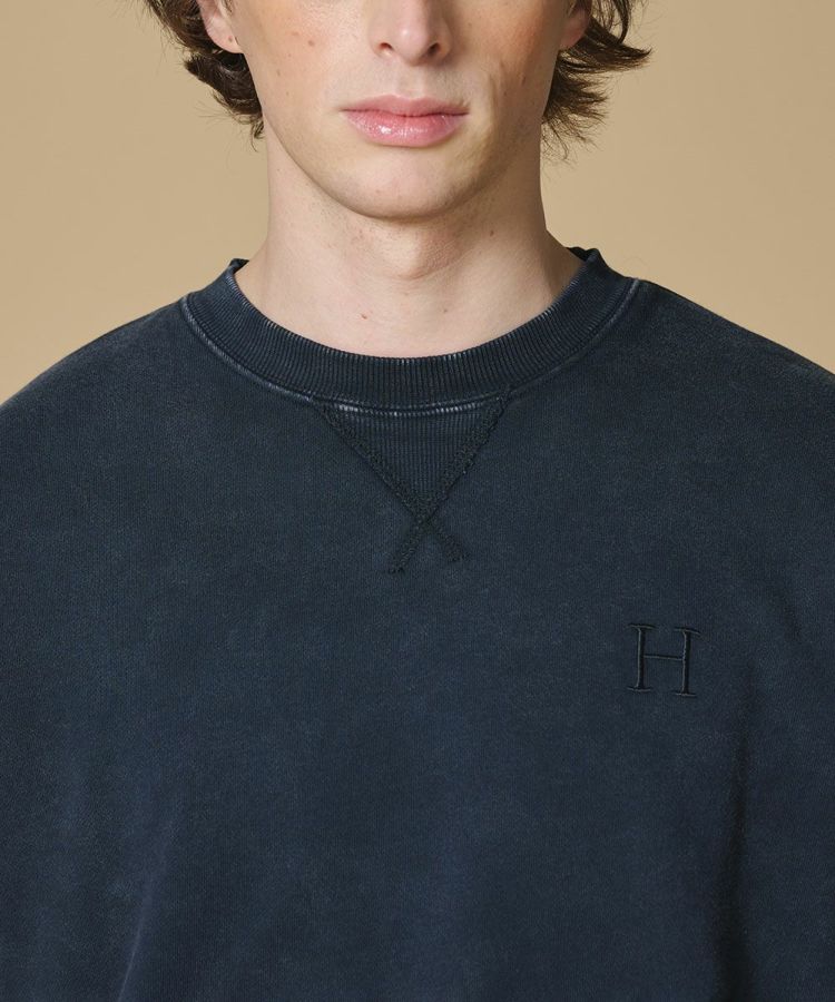 コットン100%の柔らかな肌ざわりが心地よいスウェット。インディゴ染めならではの深みのあるカラーで、どんなスタイリングにもなじみやすく、着回し力も抜群です。胸元には“H”の刺繍をあしらい、シンプルな中にさりげないアクセントをプラス。カジュアルにはもちろん、きれいめコーデにも取り入れやすいアイテムです。