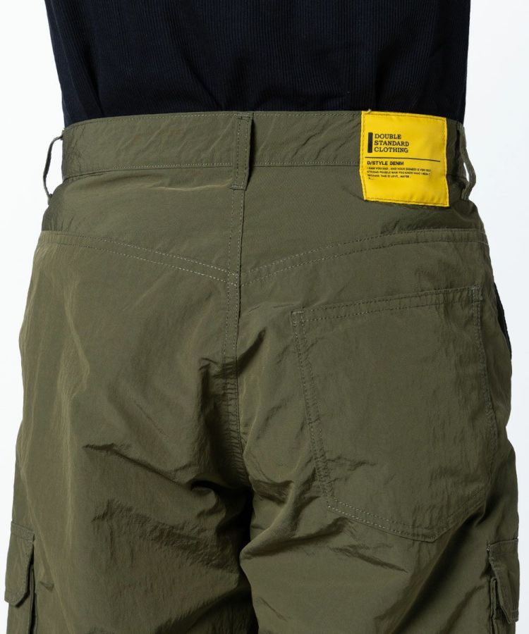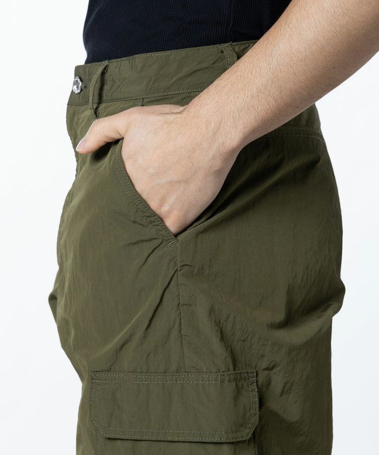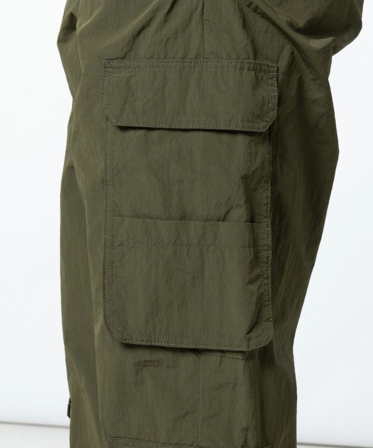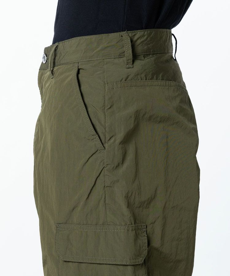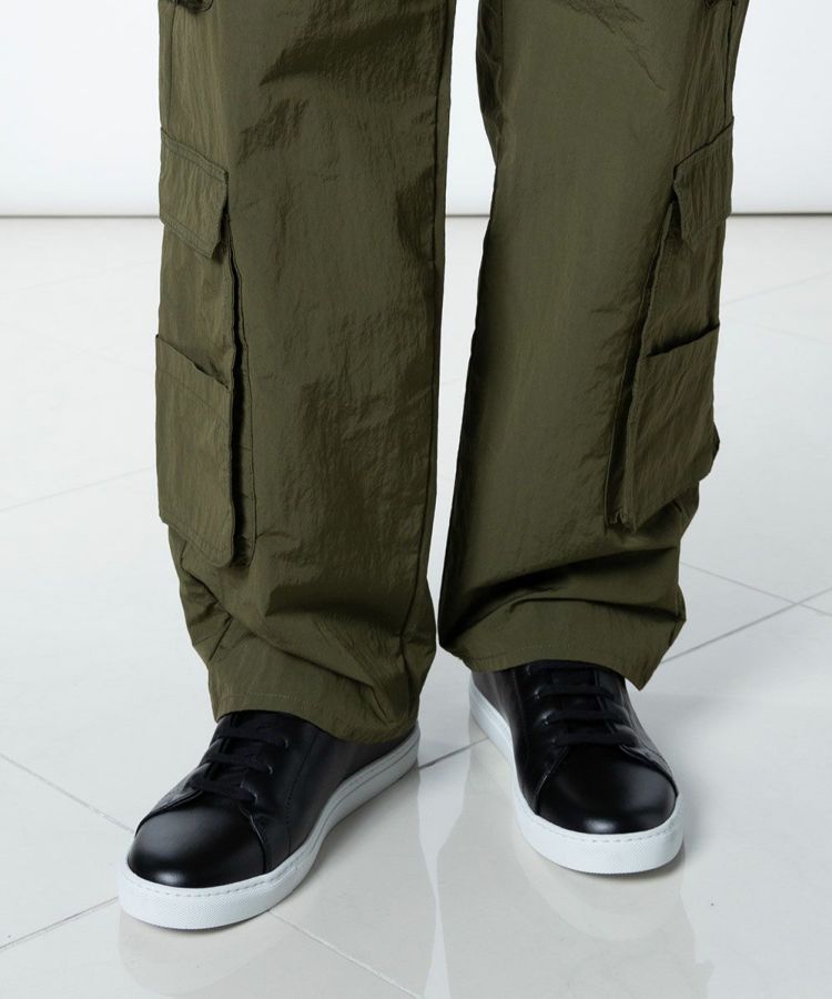 ボリューム感のあるデザインがコーディネートを格上げするナイロンカーゴパンツ。軽量のため穿き心地抜群です。ポリエステルとリサイクルナイロンを合わせてアルカリ処理した糸を使用。ふくらみ感としなやかさ、しっとりとした手触りのタフタ素材に仕上げました。スポーティーな雰囲気がありながらも上品な光沢があり、カジュアルになりすぎず大人っぽく着られる一本です。