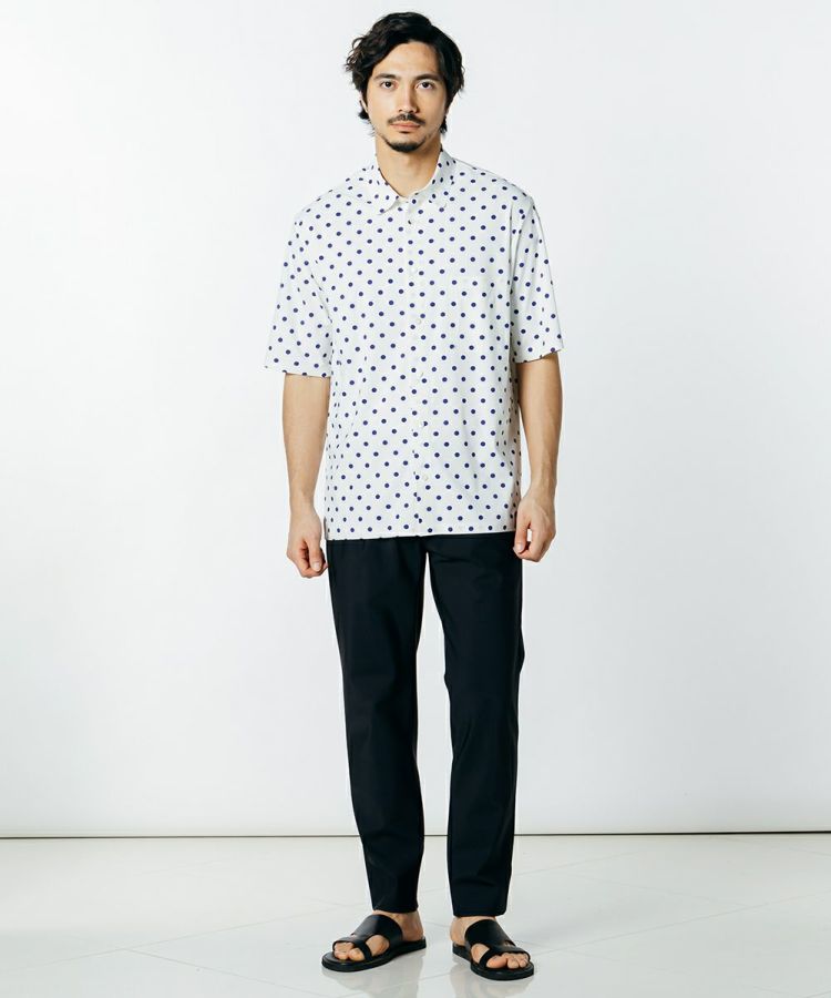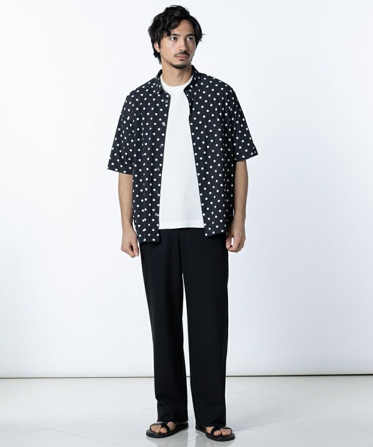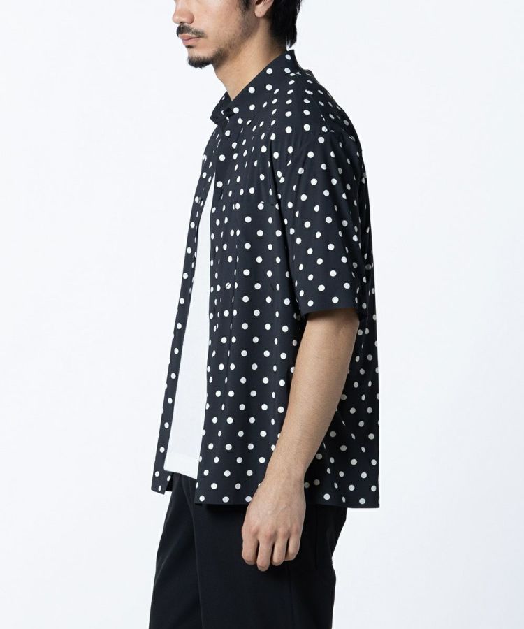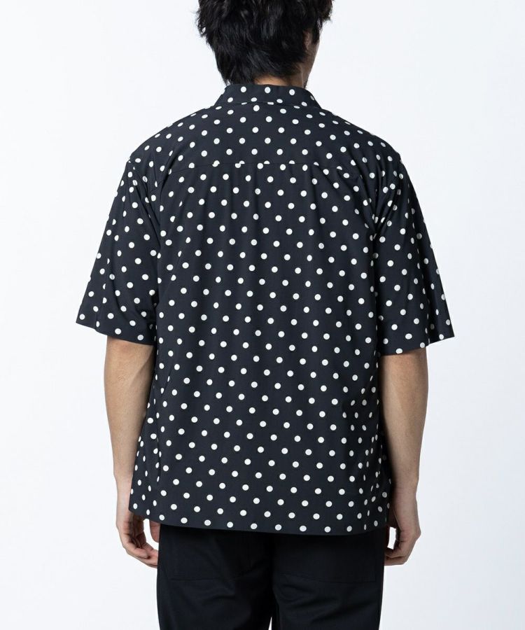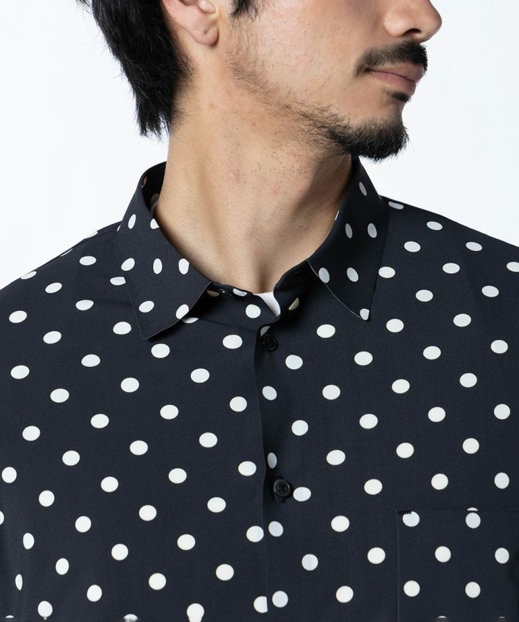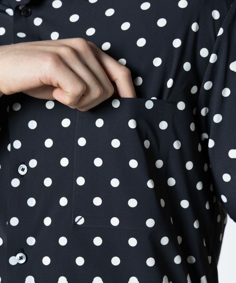 ポップでモダンな半袖シャツ。捺染のロータリーでプリントしたこだわりのドットプリントが特徴です。圧着の技法で縫製し、フラットな表面感を実現。また、帝人のウェーブローンという糸を使用しており、透けにくく、吸水性と速乾性に優れるなど機能性も抜群です。PU混のニット素材のため、ストレッチ性もあり動きやすいのもポイント。デイリーユースはもちろん、プールサイドでラッシュガード使いもOK!