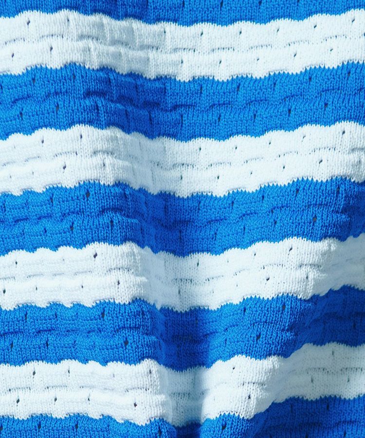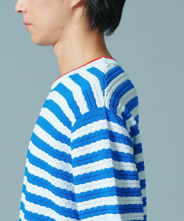 爽やかなトリコロールカラーで作ったボーダー柄のニットトップス。定番のダル糸をリップス編みにし、アイレットを入れることでひねりのある凝ったデザインに仕上げました。程よいゆとりのあるシルエットや5部丈の袖がこなれ感がたっぷり。デニムなどにサラッとラフに合わせるのがおすすめです。