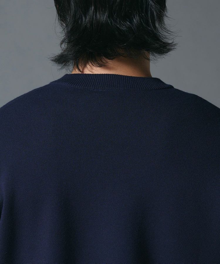 強撚のドライタッチ糸で編み上げたシャリ感のあるニット。胸元にはダブスタオリジナルロゴを立体的なジャガードであしらい、デザインのアクセントに仕上げました。袖にはダブルラインを施し、ダブスタらしい大人の雰囲気をプラス。スラックスやデニムとも好相性で、着回し力の高い一枚です。