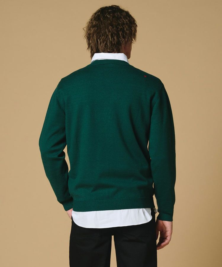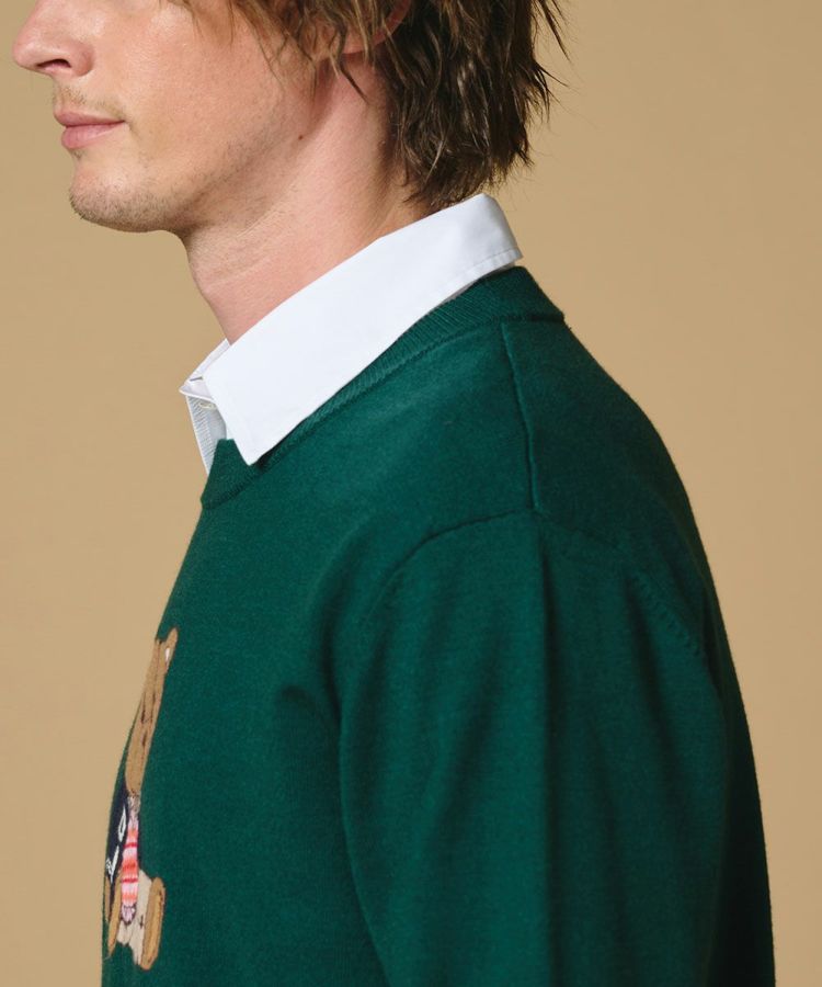 フロントにあしらった、BEARの刺繍が目を惹くニットプルオーバー。軽さ・暖かさ・柔らかさのバランスに優れた生地を使用し、心地よい着用感に仕上げました。肌なじみの良いグリーンカラーが秋の装いに上品なエッセンスをプラス。カジュアルながらも遊び心を感じさせる、大人のデイリーアイテムです。