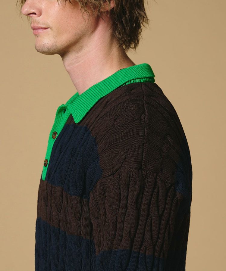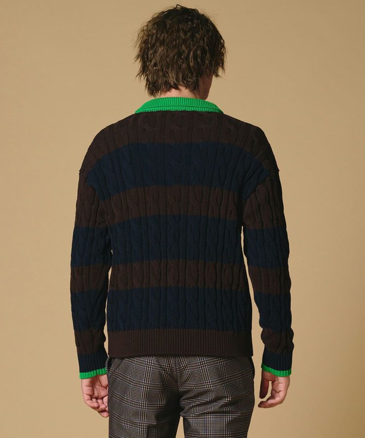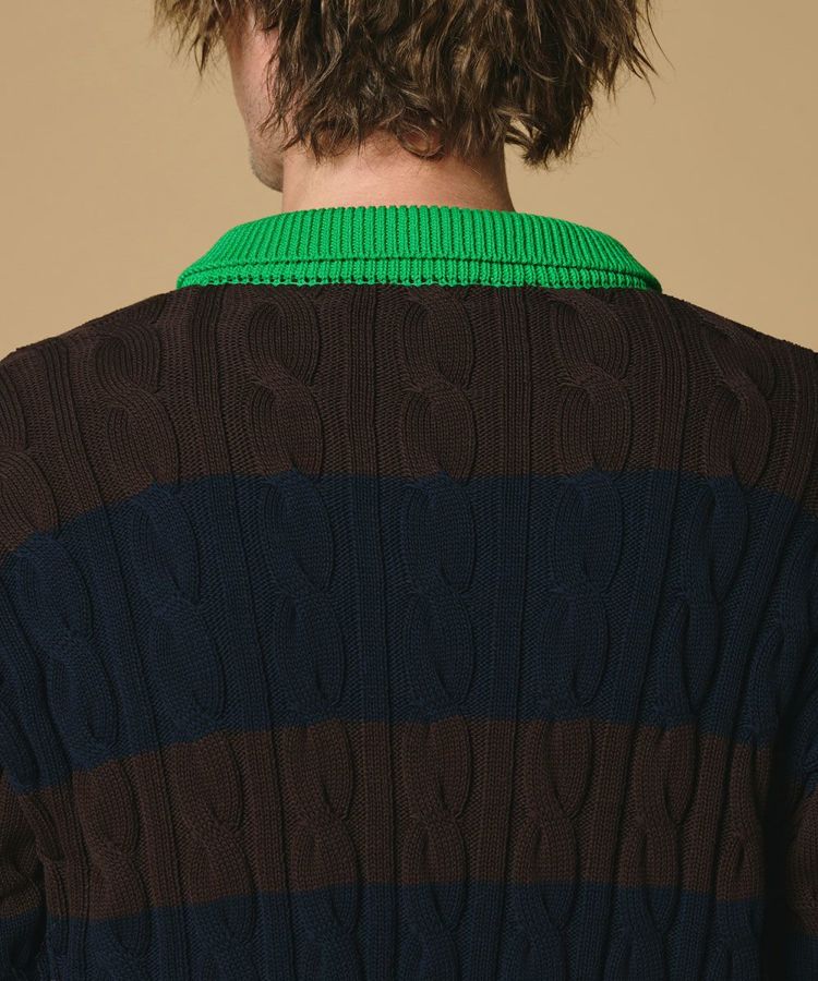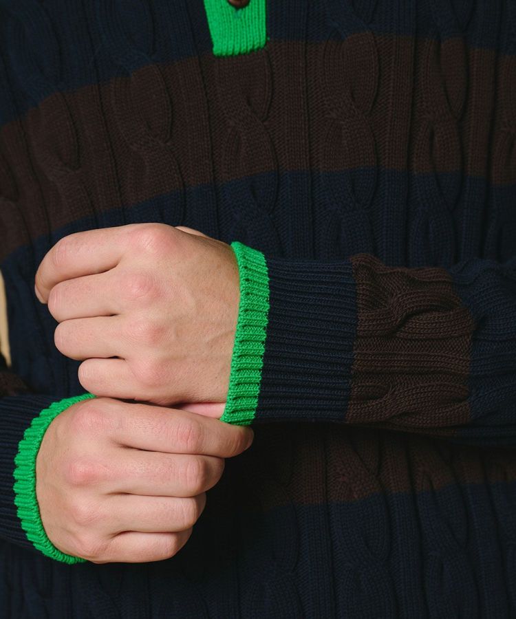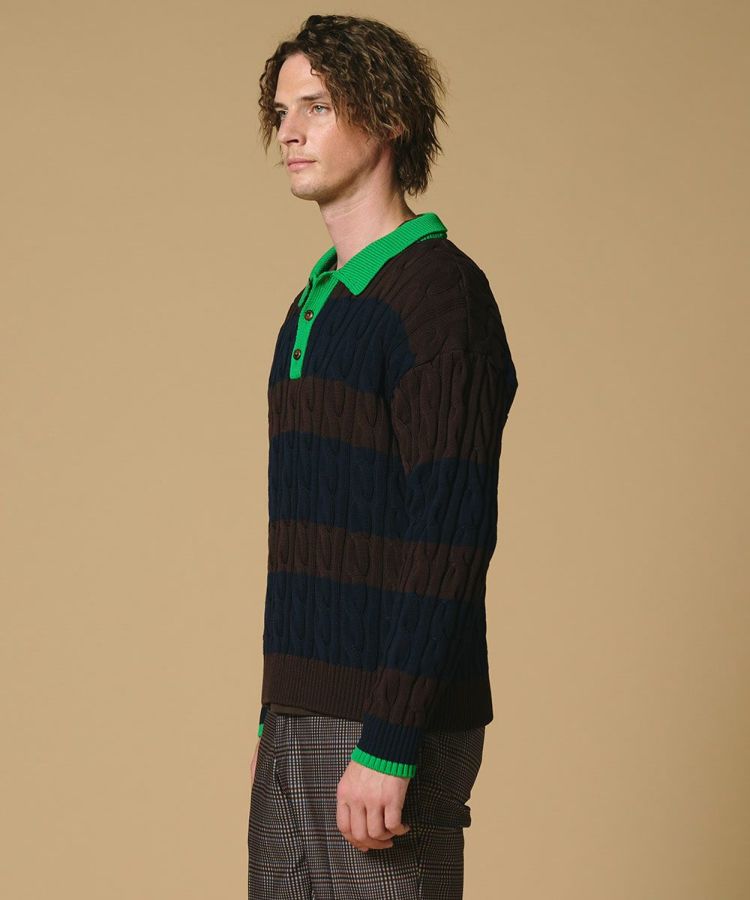 アメリカンヴィンテージのムードが漂う、クラシカルなニットポロシャツ。毛玉や毛羽立ちが起きにくいハイツイストのコットンコードヤーンを採用し、肌触りの良さと高い機能性を兼ね備えました。落ち着いたトーンのボーダーに鮮やかなグリーンをプラスしデザインのアクセントに。デニムを合わせた王道アメカジスタイルはもちろん、スラックスで上品にまとめた大人の着こなしもおすすめです。