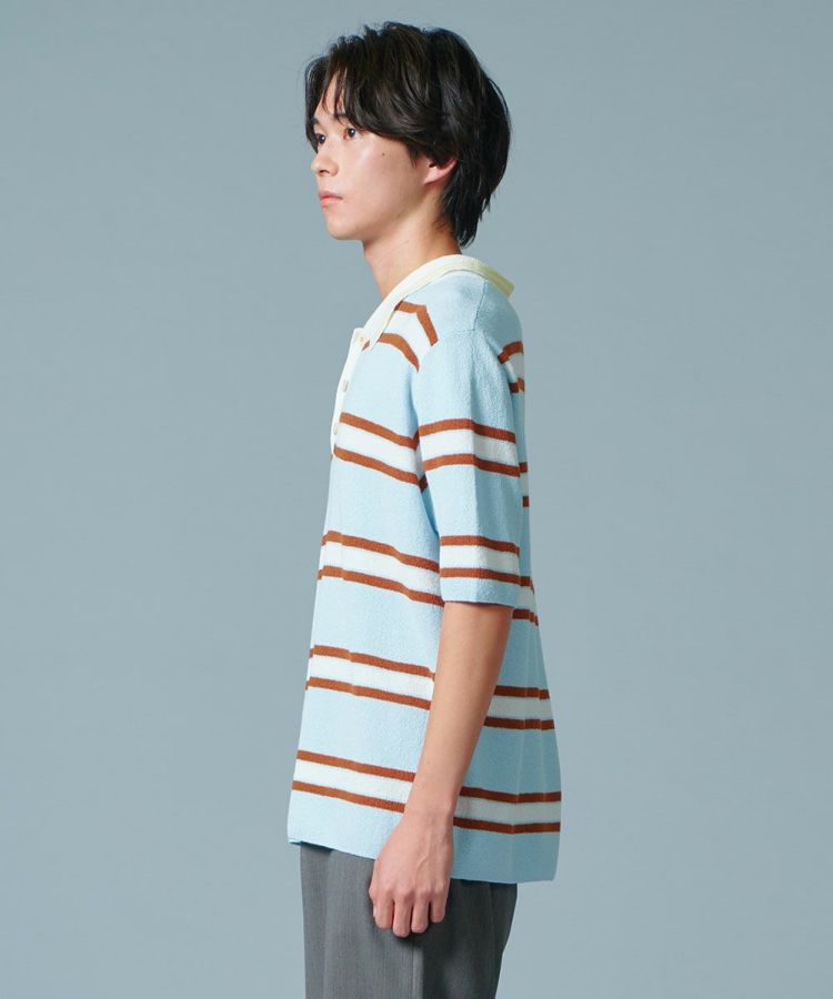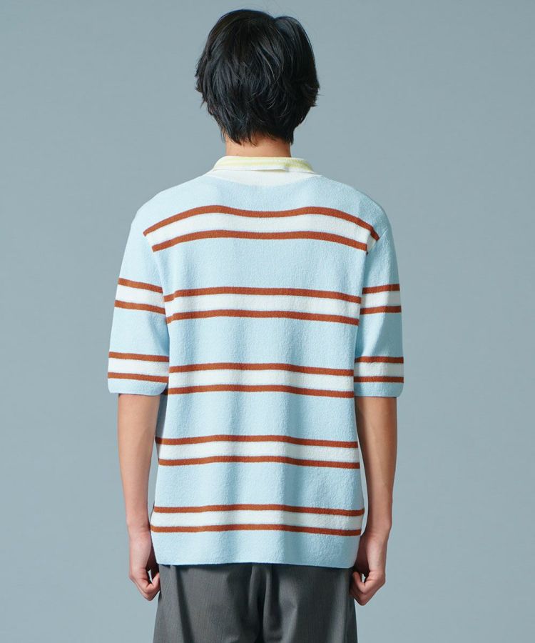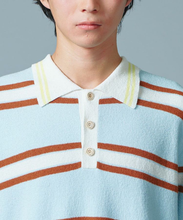 ブルー、ブラウン、イエロー、柔らかなカラーリングが特徴のポロシャツ。細番手のミニブークレ糸を使用したニット生地で、ふんわりとした肌あたりの良さとパイルのような爽やかな質感が魅力です。軽量なのもうれしいポイント。春夏のデイリーユースにぴったりなアイテムです。