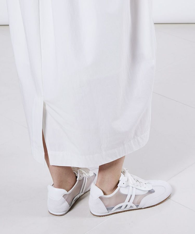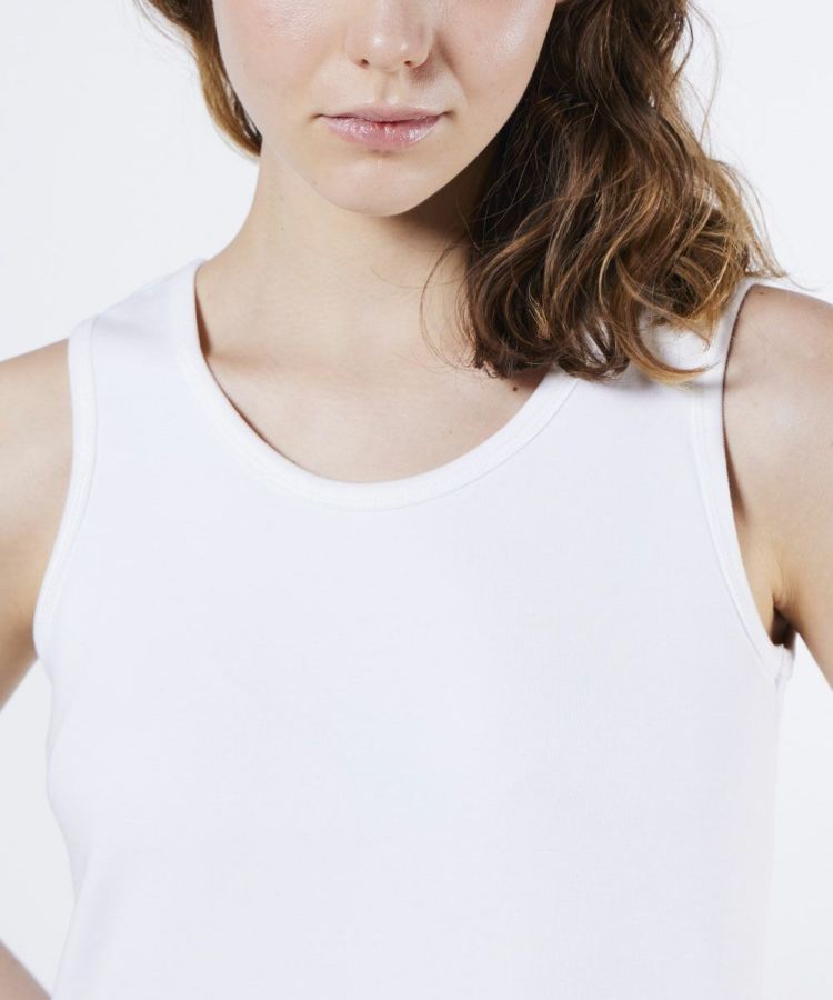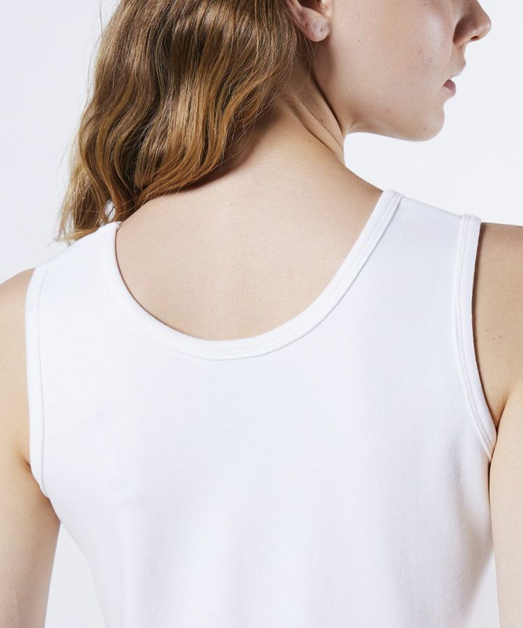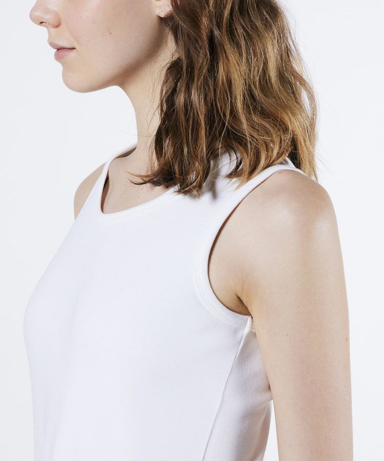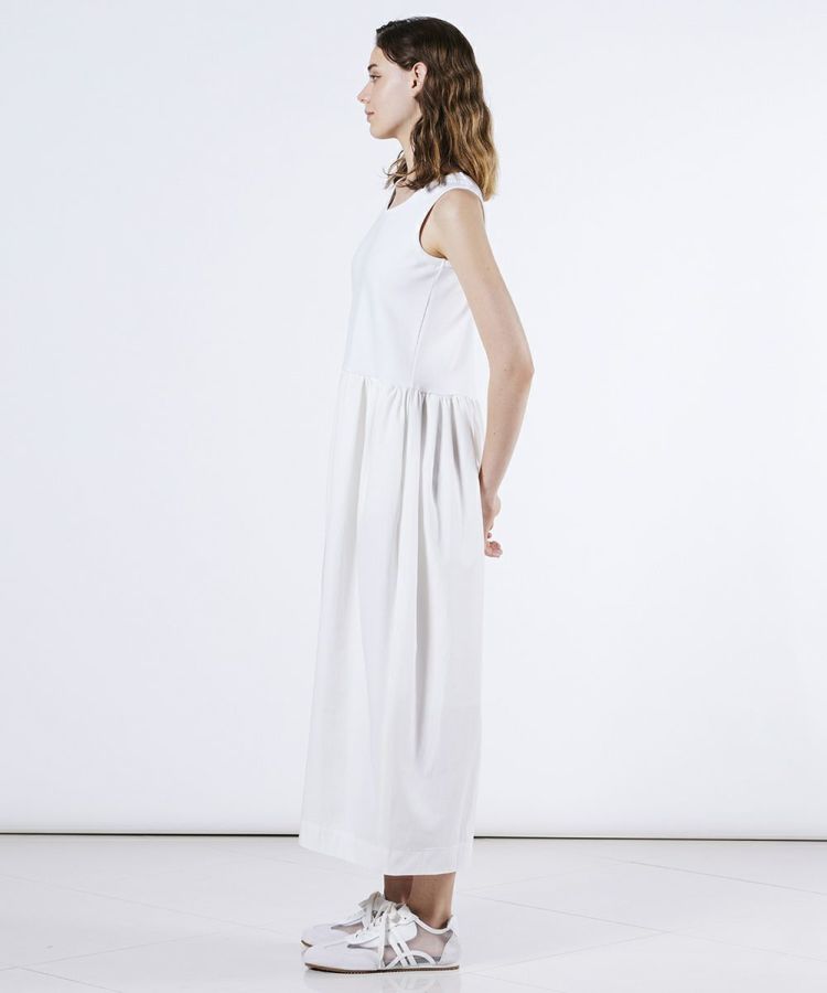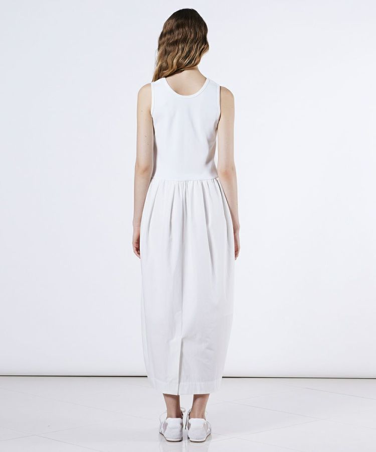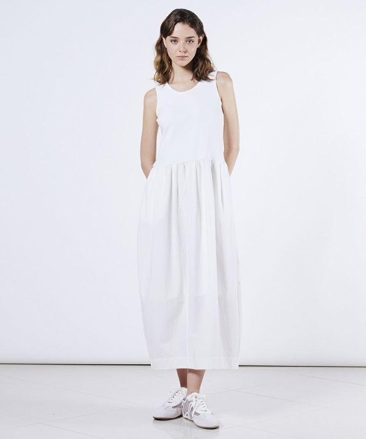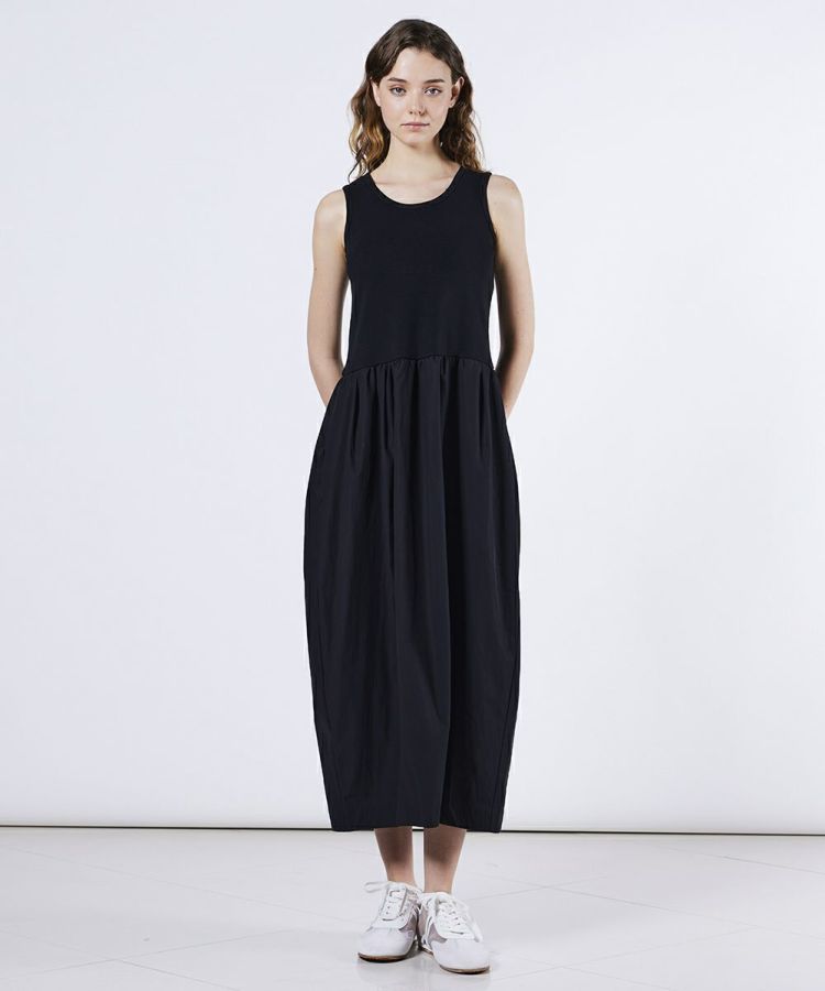 肉厚で肌ざわりの良いベアフライス生地のタンクトップとハリ感のあるタフタ素材を組み合わせた異素材ワンピース。トップスは程よいフィット感がありつつ、スカート部分にボリュームを持たせてメリハリのあるシルエットに仕上げました。腰まわりのラインを気にせず、着用できるのもうれしいポイント。ワードローブに一枚あると重宝する万能アイテムです。