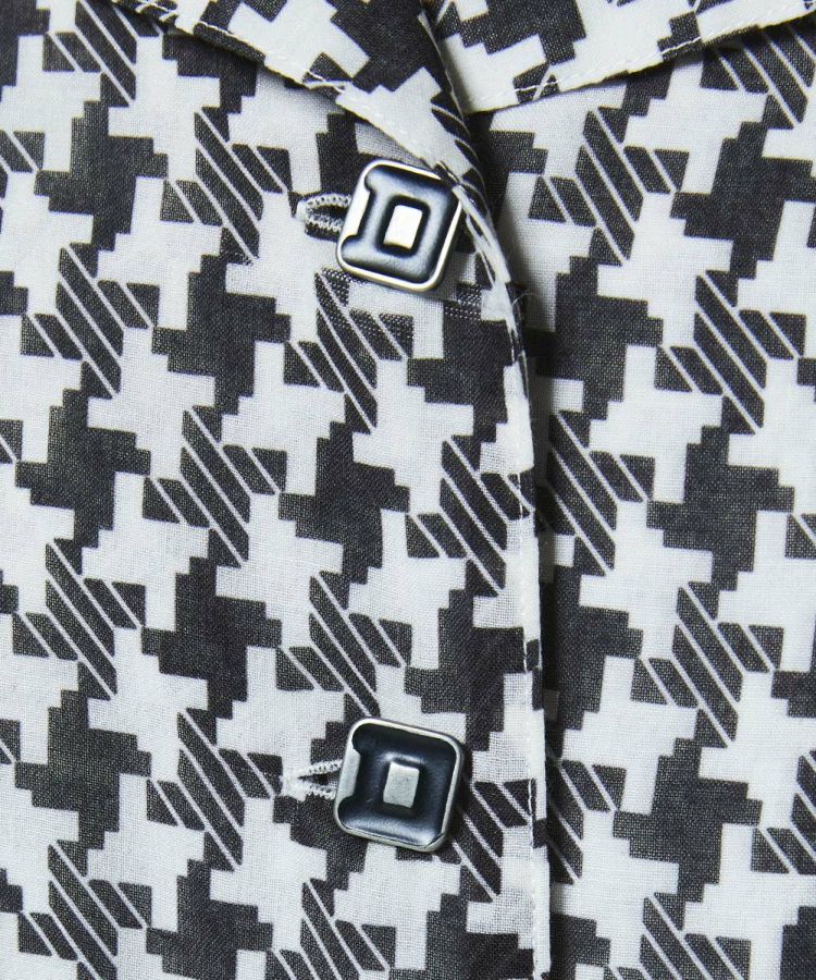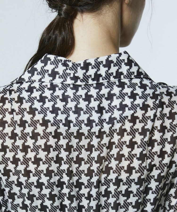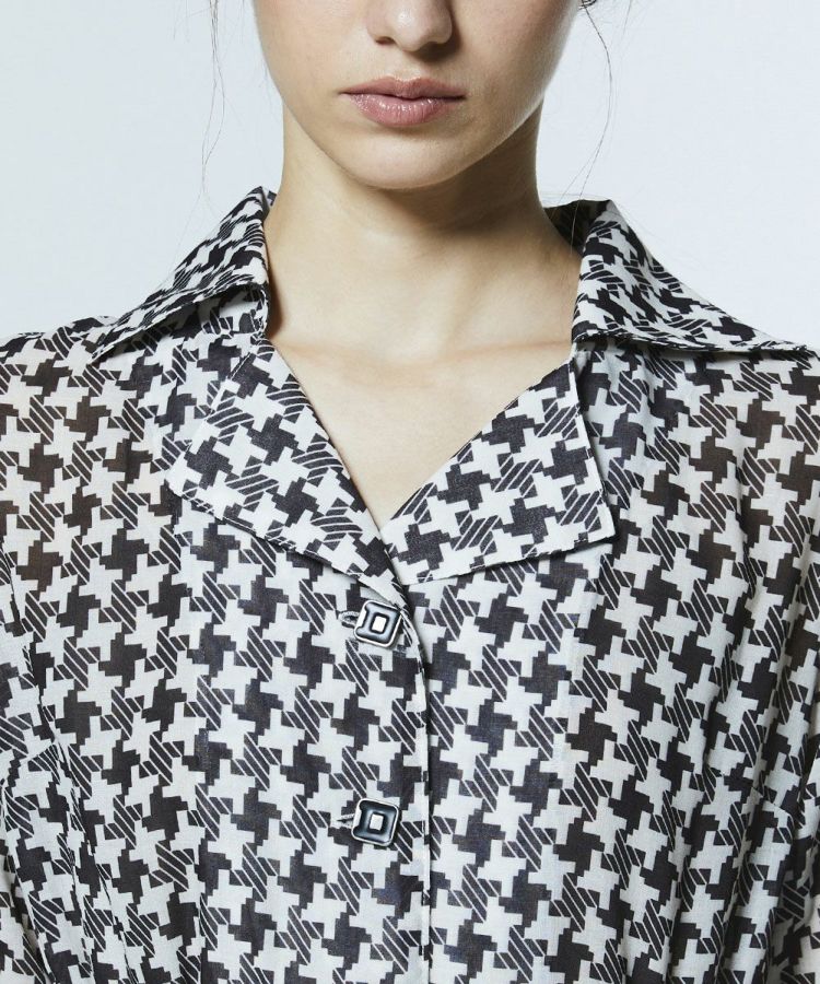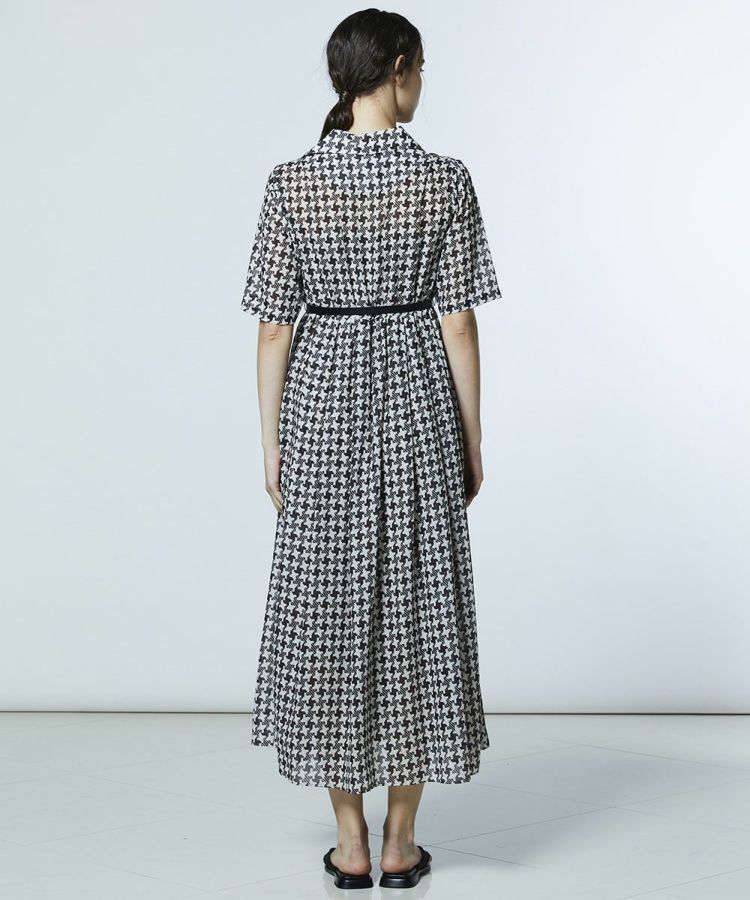 オープンカラーがレトロな雰囲気を漂わせるワンピース。モノトーンの幾何学柄を全面にあしらい、クールで洗練された印象に仕上げました。ウエストには細めのベルトを添え、自然なメリハリのあるシルエットを演出。柔らかなシフォン素材の程よい透け感が軽やかさをプラスし、1枚でスタイリングが完成する万能なアイテムです。