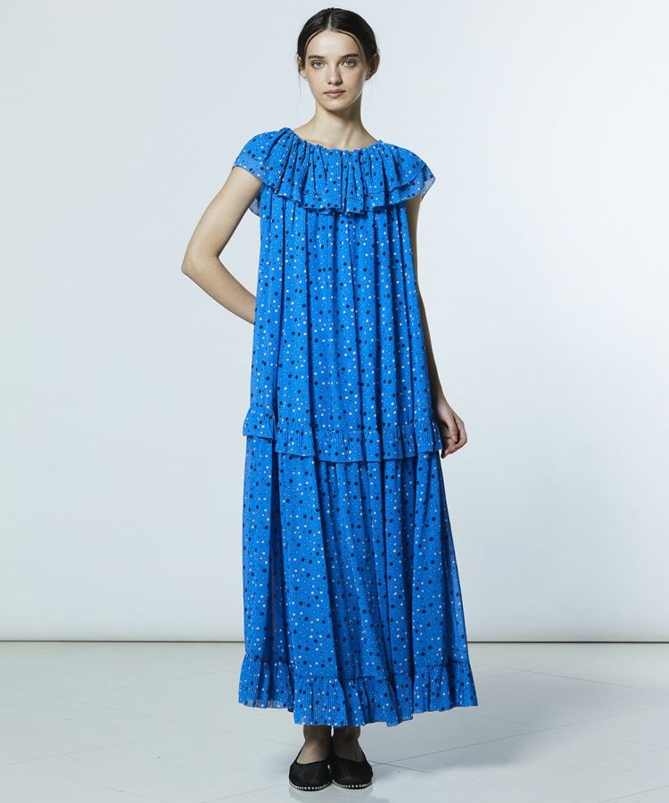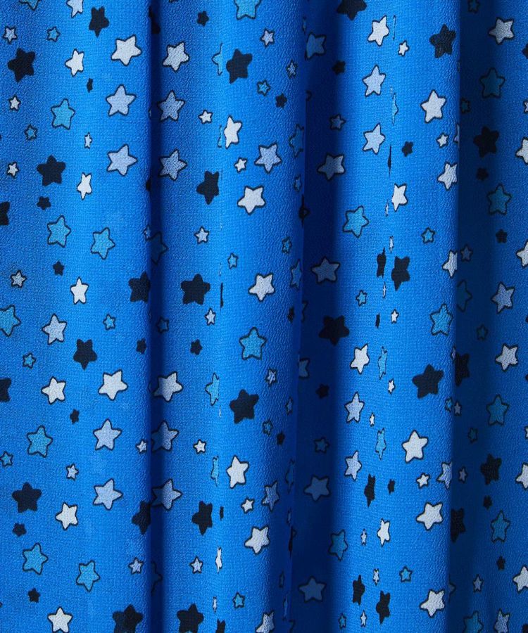 鮮やかなブルーにポップなスター柄が映える、爽やかな印象のワンピース。肩やデコルテラインを美しく見せるオフショルダー風の着こなしと、リラックス感のあるスタイルが楽しめる2WAY仕様です。裾にはフリルをあしらい、女性らしいアクセントをプラス。1枚で異なる表情を楽しめるデザインで、スタイリングの幅が広がる便利なアイテムです。