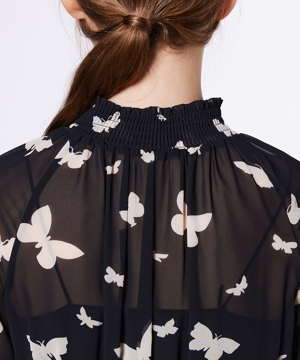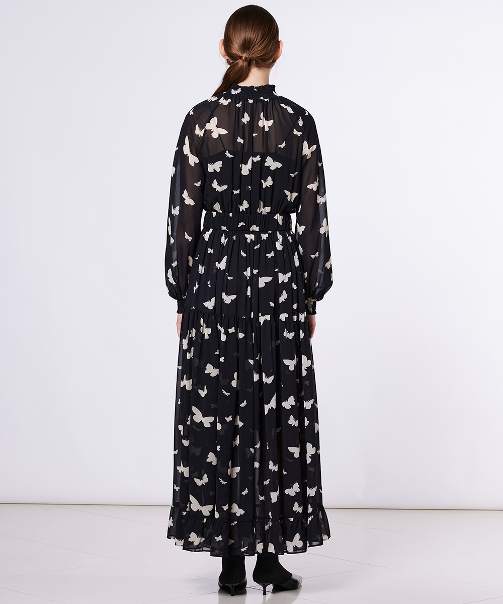 全面にあしらったバタフライプリントが華やかなワンピース。シアー感のあるシフォン素材で程よく肌が透け、軽やかな抜け感を演出します。ウエストに施したシャーリングが女性らしいシルエットを実現。1枚で主役級の着映えを叶えるアイテムは、ワードローブに加えておくだけで重宝します。