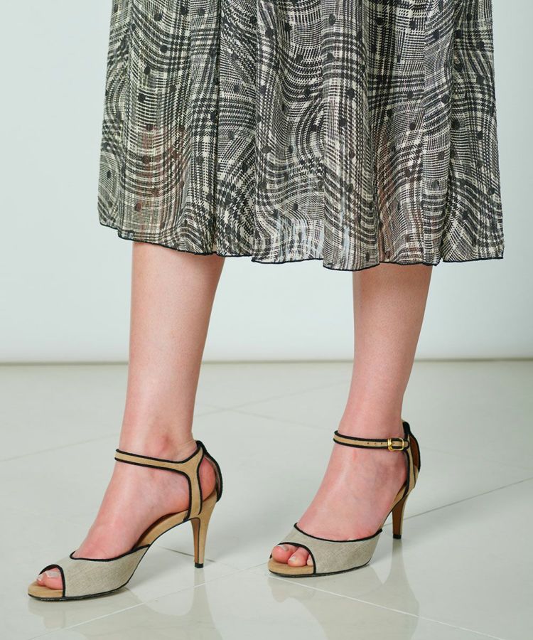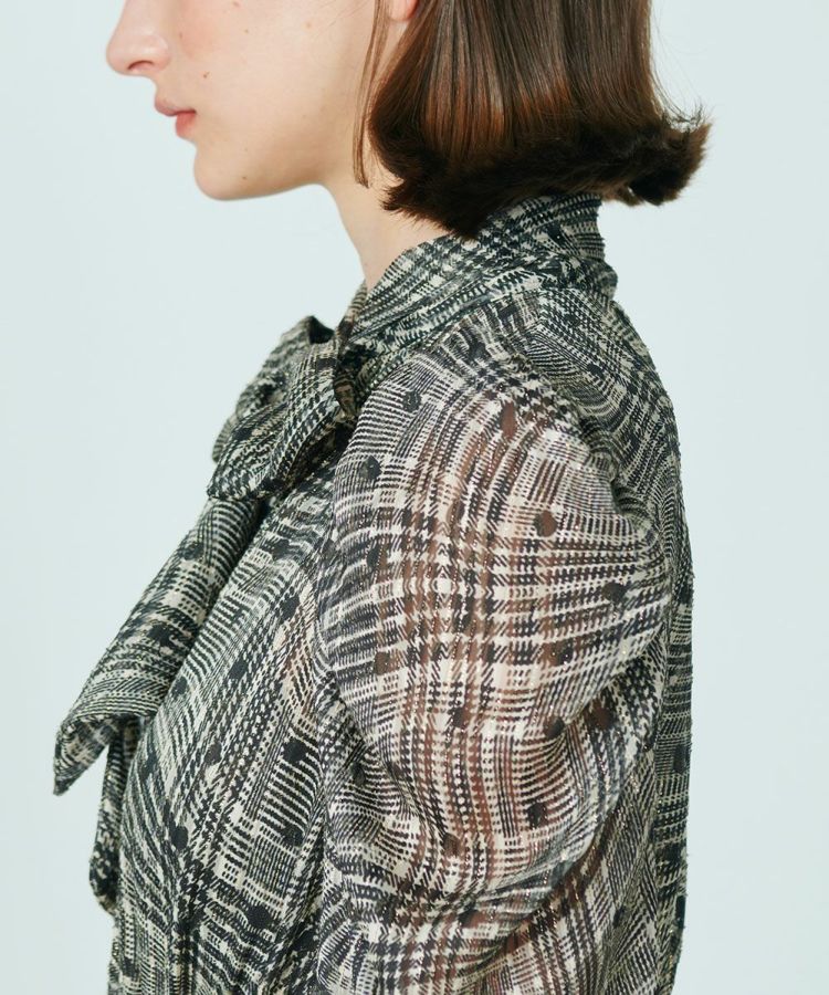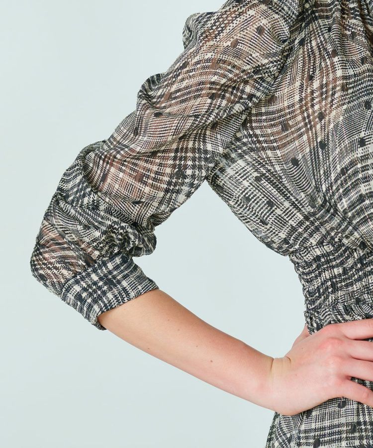 シックなカラーリングで大人っぽく仕上げたシフォン生地のワンピース。クラシカルなチェック柄を曲線で表現し、ドットを組み合わせてさりげない遊び心を効かせています。また、襟元のリボンもポイントに。ほんのり開いているのがセンシュアルなムードを演出してくれます。腕のラインをさりげなくカバーしてくれたり、ウエストはゴム仕様で楽チンながらも高めの位置に設定しているのでハイウエスト効果抜群があり、一枚でスタイル良く見せてくれるのも魅力的。
