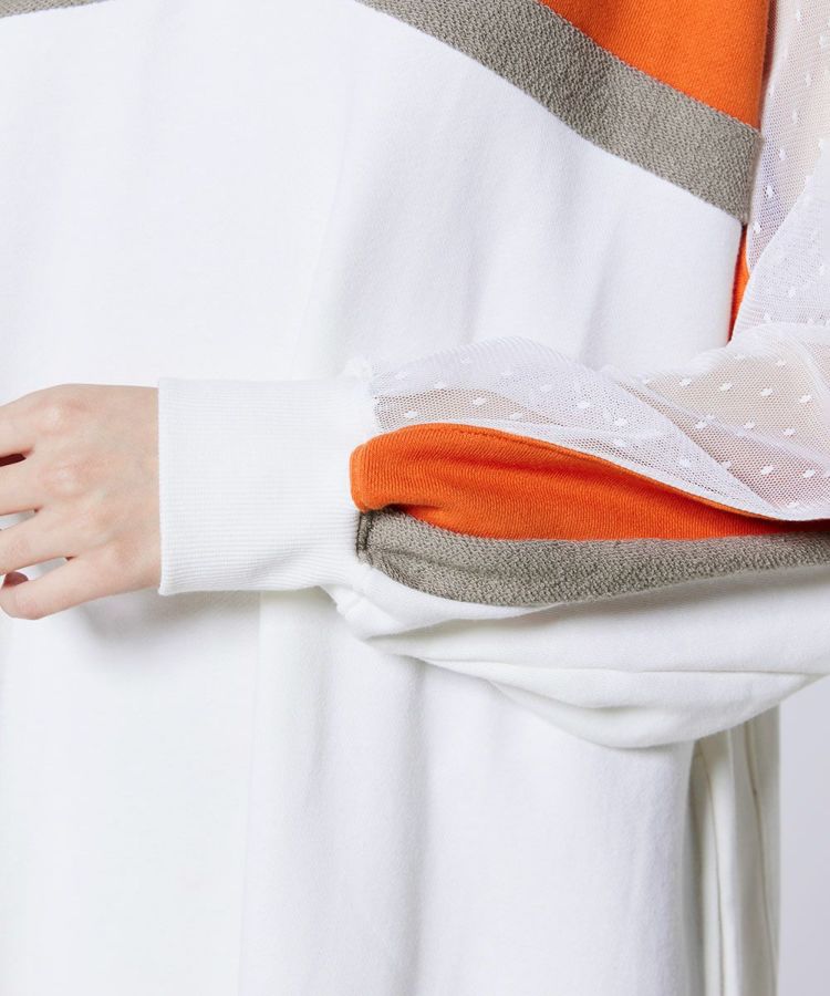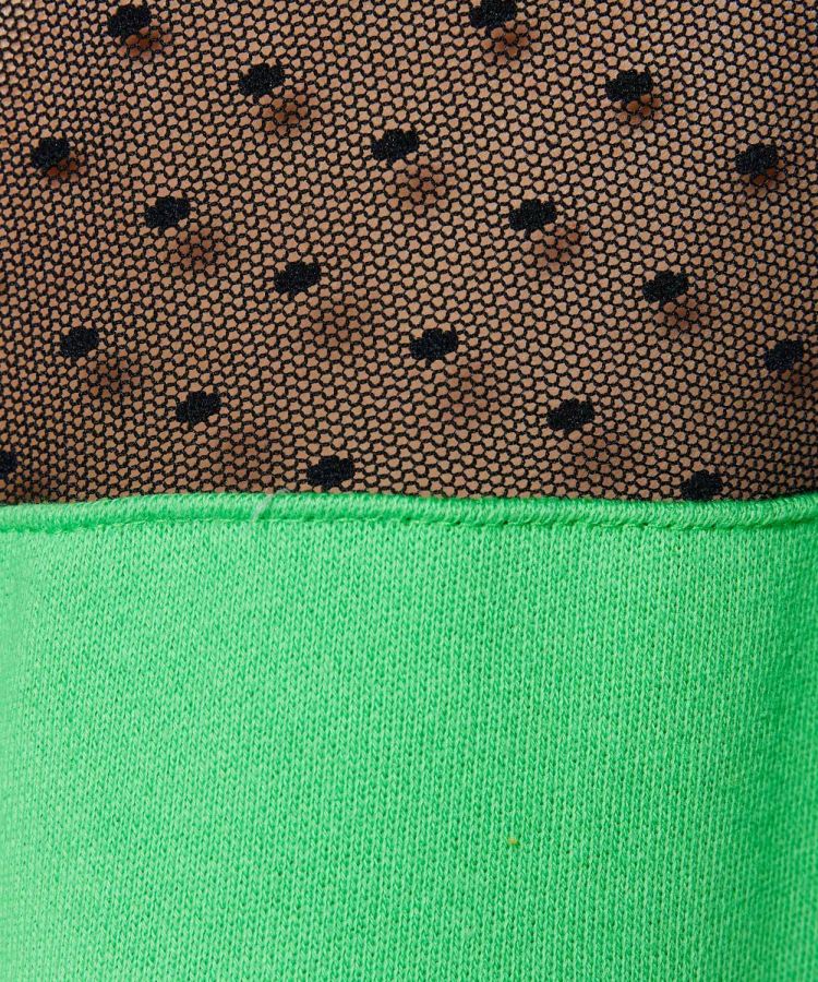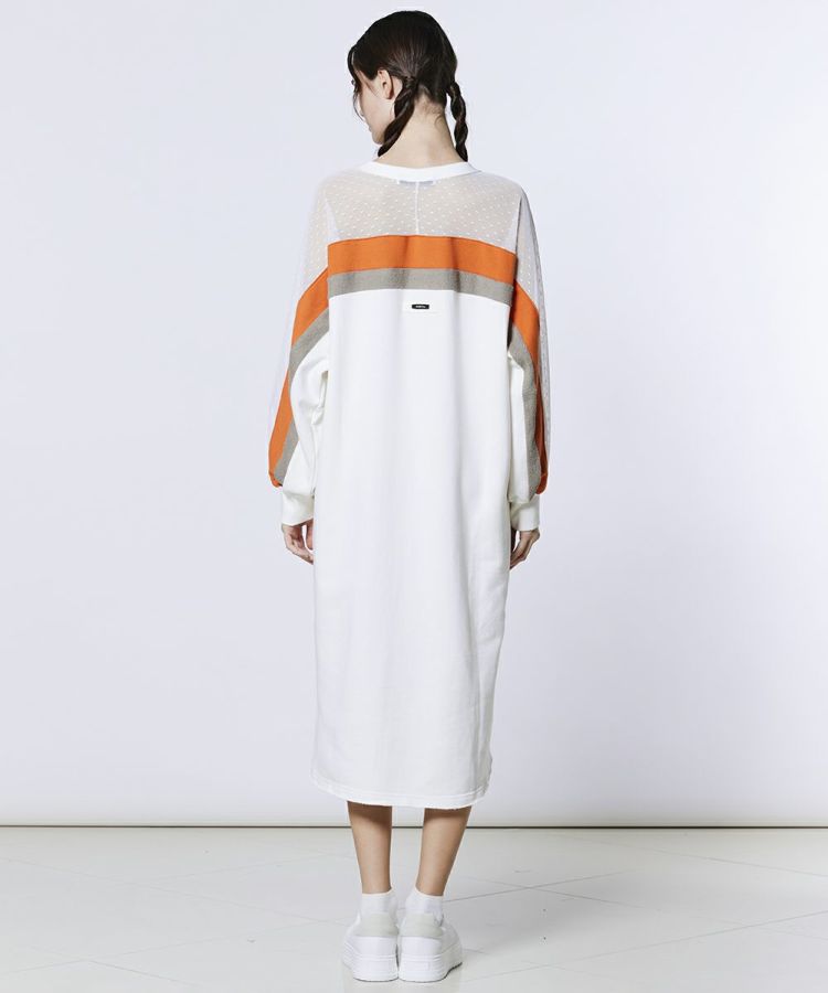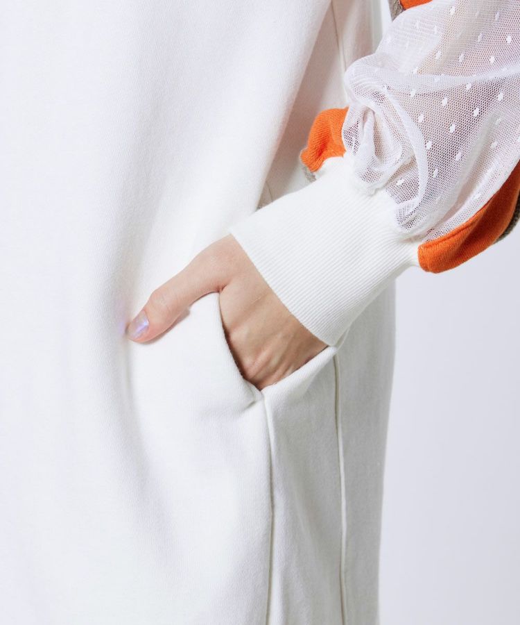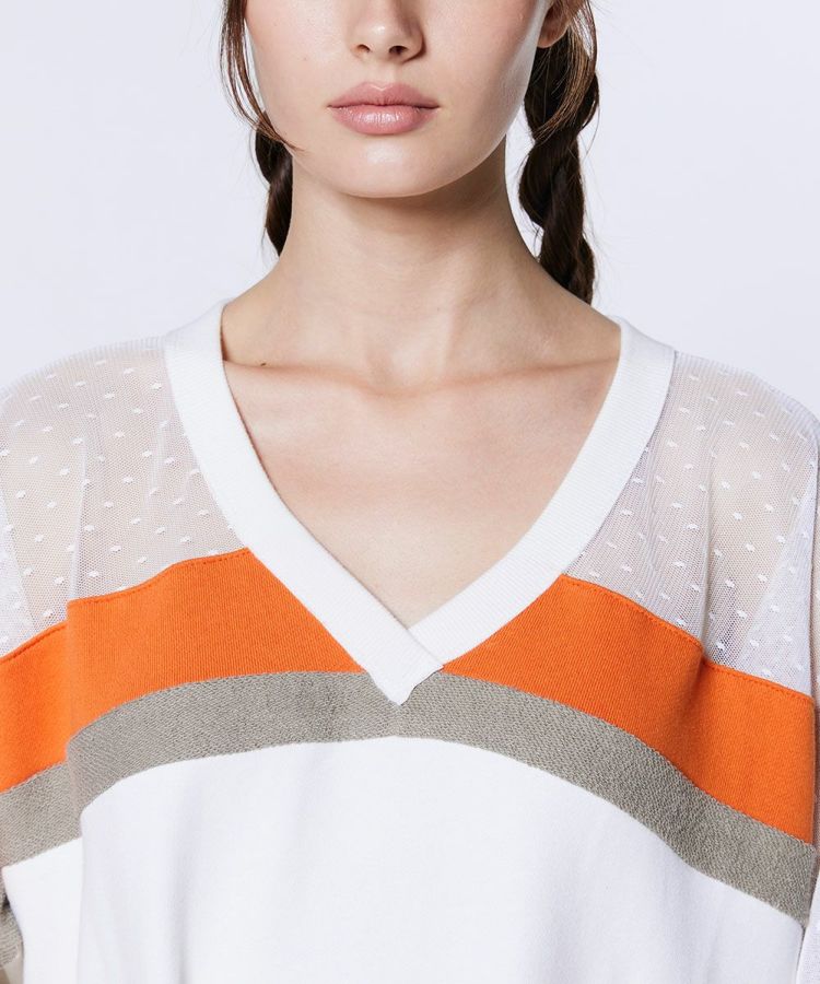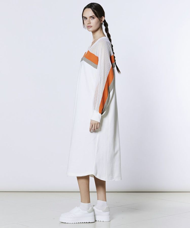 スポーティーなスタイリングを楽しめるワンピース。Vネックデザインがデコルテラインをすっきりと美しく演出します。肩から腕にかけては、透け感のあるドットチュールをあしらい、ヘルシーな肌見せをプラス。着るだけでスタイリングが決まる一枚は、ワードローブに加えておくと幅広いシーンで活躍するアイテムです。