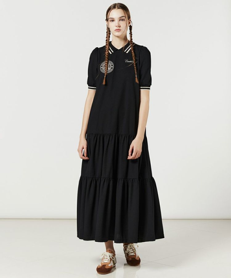 スポーツライクなポロシャツのデザインと、ガーリーなティアードスカートを組み合わせたワンピース。ゆったりと描くAラインが大人かわいいポイントで、前横後、どこから見てもシルエットが抜群です。袖はほんのりとパフスリーブ。バックはボタンデザインでひと手間をプラスし、デザイン性をアップ。ブランドらしい大人の遊び心が詰まった一着です。
