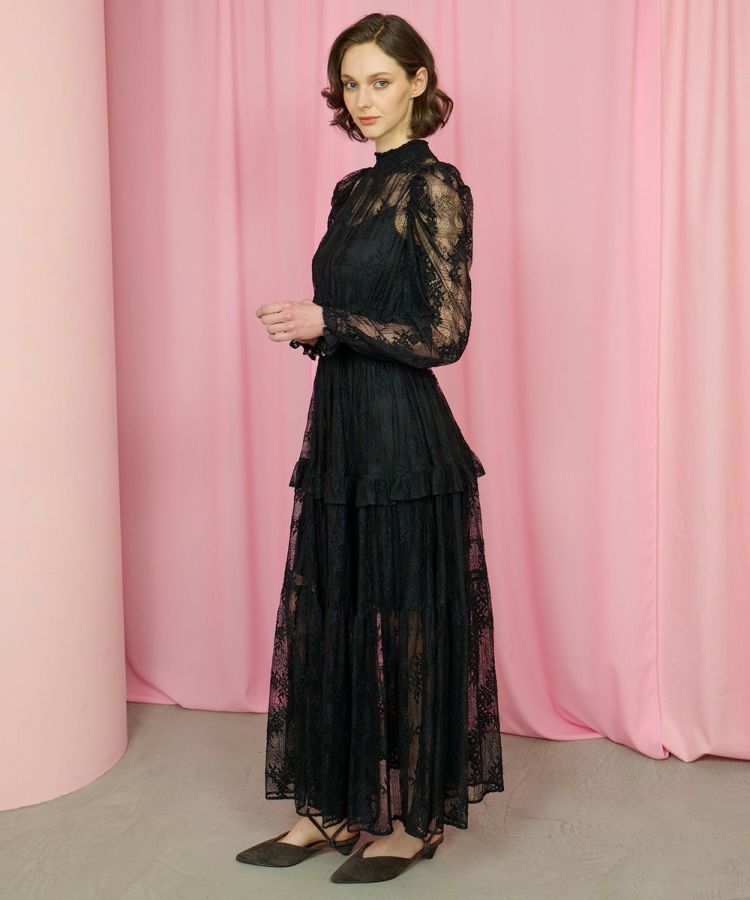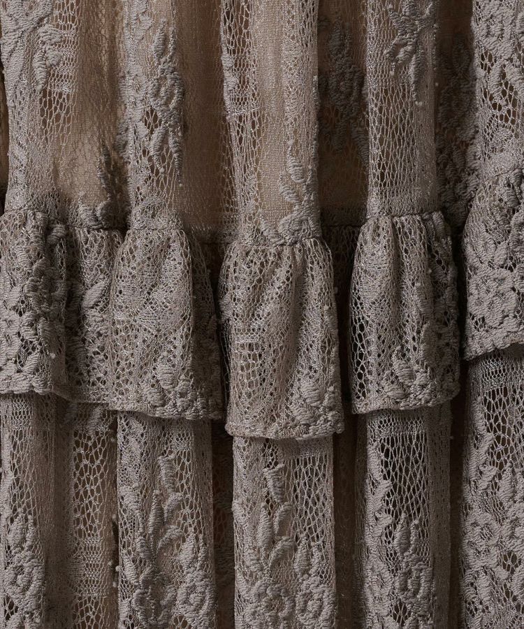 程よい肌見せが叶う、センシュアルで大人エレガントなワンピース。繊細なフラワーモチーフのレースが華やかさと女性らしさを引き立てます。ふんわりとしたパフスリーブが上品な大人の可愛らしさを添えて、裾に向かって広がるティアードスカートが優雅な雰囲気を演出。特別なお出かけやパーティー、オケージョンシーンにもふさわしい一着です。