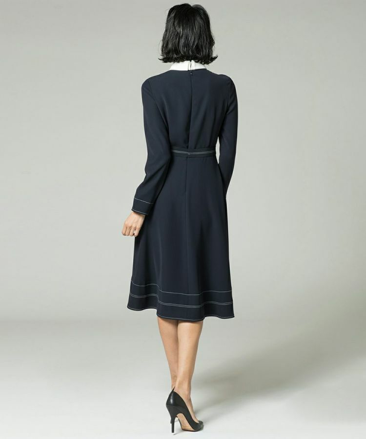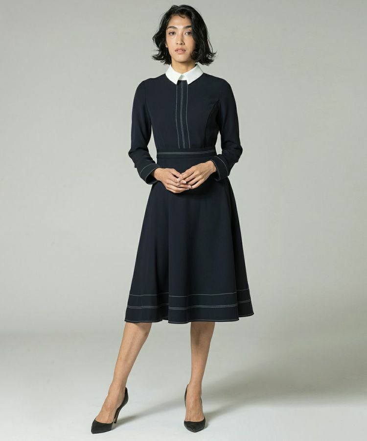 ホワイトカラーと白のステッチを生かした、クラシカルなワンピース。