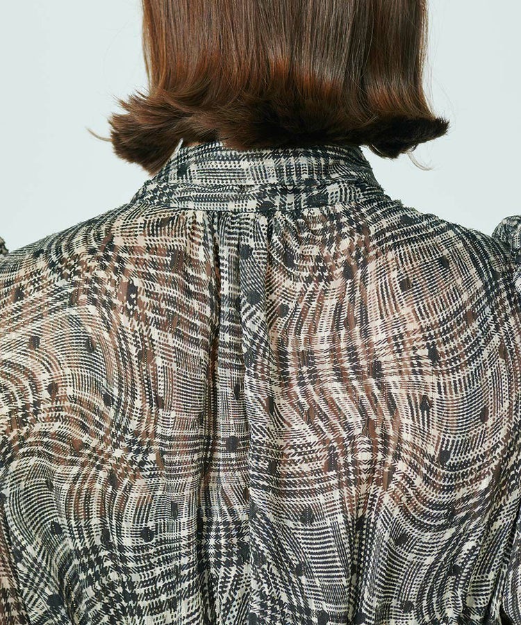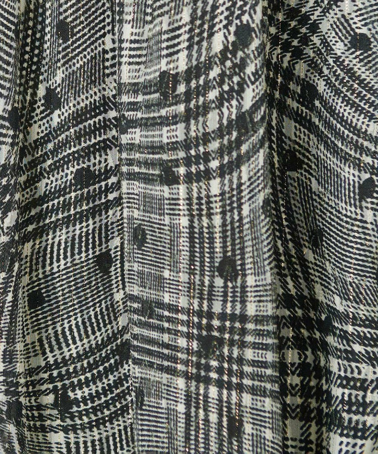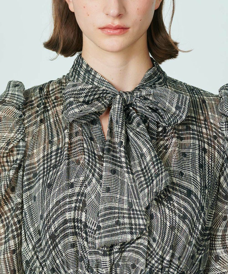 シックなカラーリングで大人っぽく仕上げたシフォン生地のワンピース。クラシカルなチェック柄を曲線で表現し、ドットを組み合わせてさりげない遊び心を効かせています。また、襟元のリボンもポイントに。ほんのり開いているのがセンシュアルなムードを演出してくれます。腕のラインをさりげなくカバーしてくれたり、ウエストはゴム仕様で楽チンながらも高めの位置に設定しているのでハイウエスト効果抜群があり、一枚でスタイル良く見せてくれるのも魅力的。