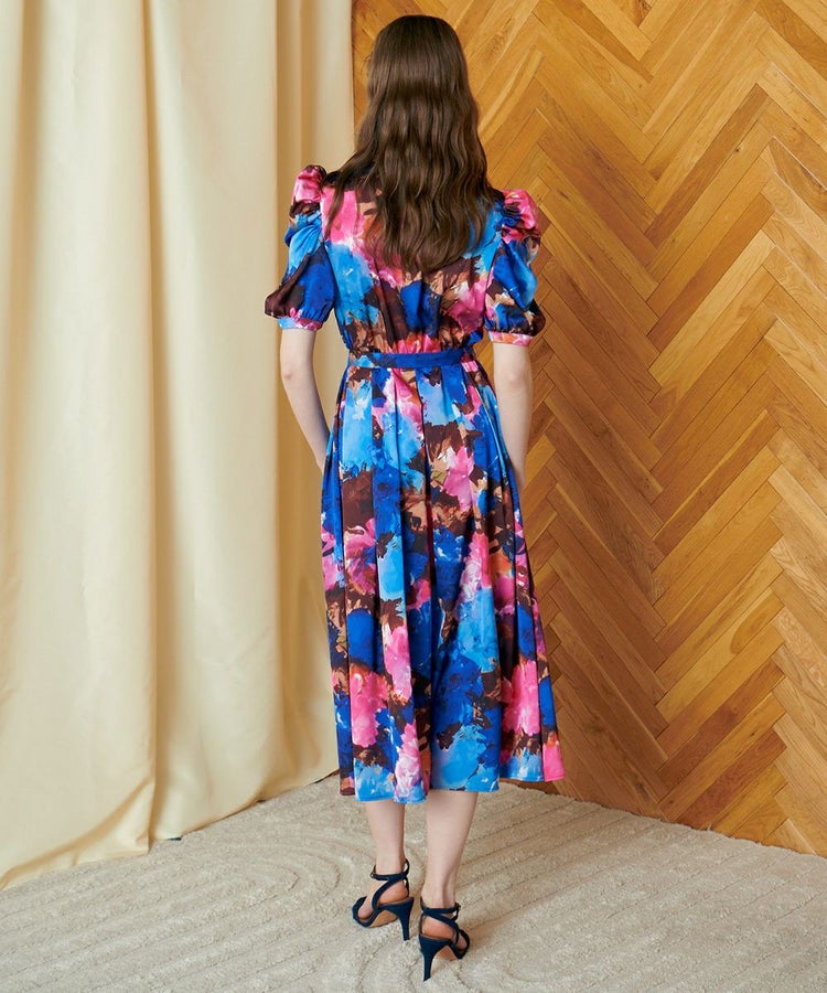 絵画のような印象的なタッチで描いたプリント柄が目を惹くワンピース。ビビッドなカラーリングも華やかです。レトロなシャツデザインもポイントで、どこかノスタルジックな雰囲気。ややボリュームのある袖は、腕のラインをきれいに演出してくれます。また、スカート部分は切り替えをつけ、さらにドレープを効かせることで、横や前から見た時のシルエットがとてもきれいです。