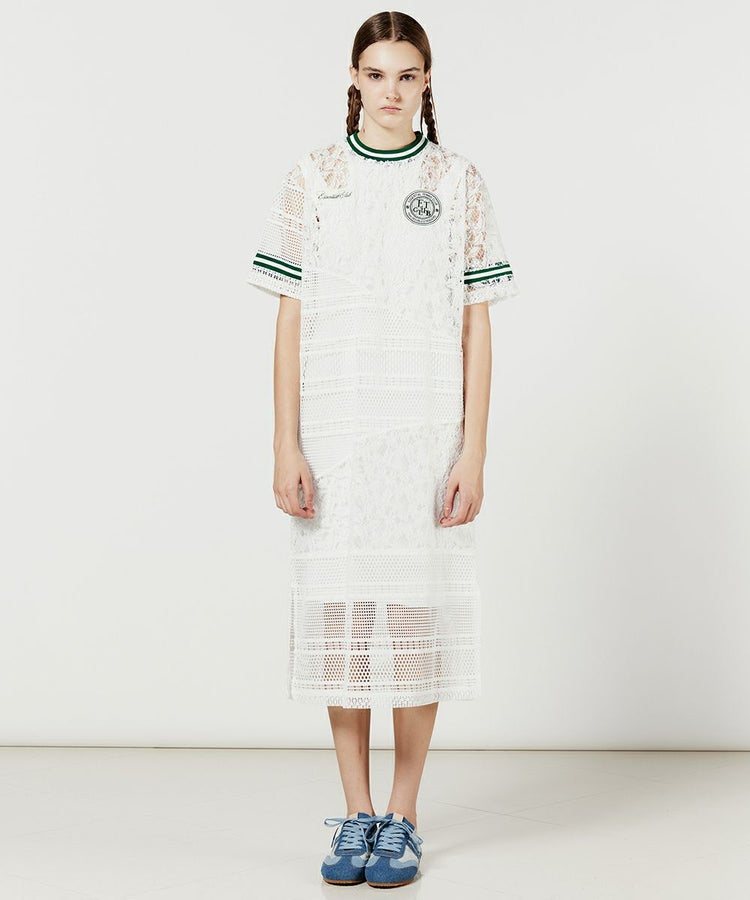 胸元の刺繍ワッペンや襟元のラインなど、今季らしいアイビーテイストを盛り込んだワンピース。涼しげなレース素材で抜け感を出すとともに、女性らしくトレンドライクに着用できるように仕上げました。また、異なるレースを組み合わせ、変化を出しているのもさりげないポイント。ゆったりとしたシルエットながらも、こだわりのディテールでラフになりすぎず、大人カジュアルに楽しめます。