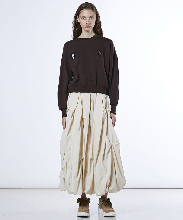 ボリューム感のあるバルーンシルエットが印象的なロングスカート。ランダムに施したタックが華やかさを添え、動きのある表情を演出します。存在感のあるデザインには、Tシャツやコンパクトなトップスが相性抜群。トップスを変えるだけでカジュアルにもモードにも着こなせる一枚です。