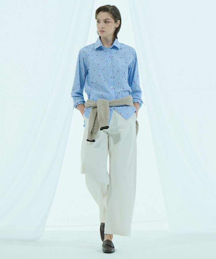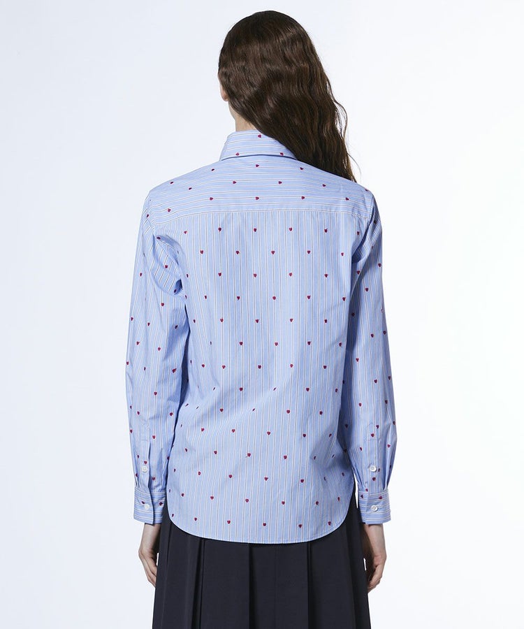 全面にハートの刺繍を散りばめたキュートなシャツ。先染めストライプ生地を使用することで、可愛くなりすぎず大人っぽく仕上げました。やや長めの丈感で腰まわりをカバーできるのも嬉しいポイント。1枚でさらりと着るのはもちろん、カーディガンやニットとのレイヤードにも活躍する一枚です。