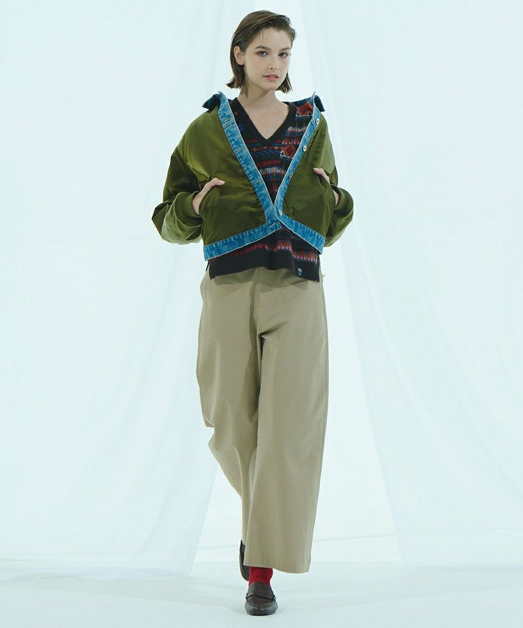 異素材の組み合わせがスタイリッシュなMA-1ジャケット。グロッシーな光沢と程よい厚みが特徴的なナイロン素材を採用し、軽やかで快適な着心地を実現しました。デニム部分にはブリーチバイオ加工を施し、ヴィンテージライクな風合いをプラス。羽織るだけでコーデが決まる存在感のある一着は、カジュアルにもガーリーにもマッチする万能アウターです。