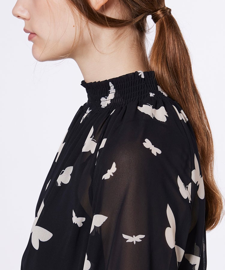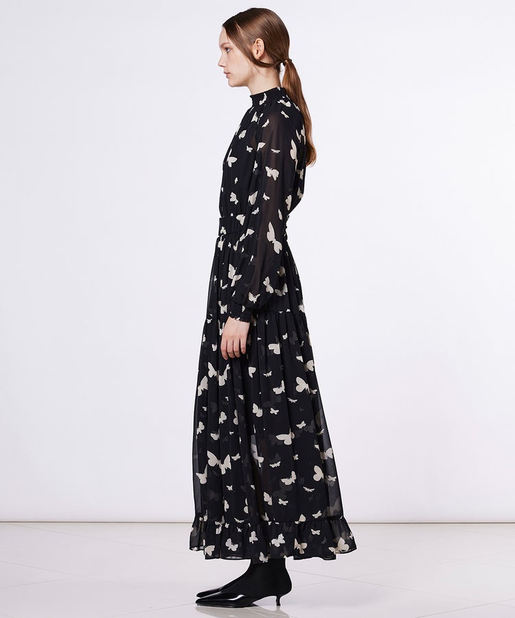 全面にあしらったバタフライプリントが華やかなワンピース。シアー感のあるシフォン素材で程よく肌が透け、軽やかな抜け感を演出します。ウエストに施したシャーリングが女性らしいシルエットを実現。1枚で主役級の着映えを叶えるアイテムは、ワードローブに加えておくだけで重宝します。