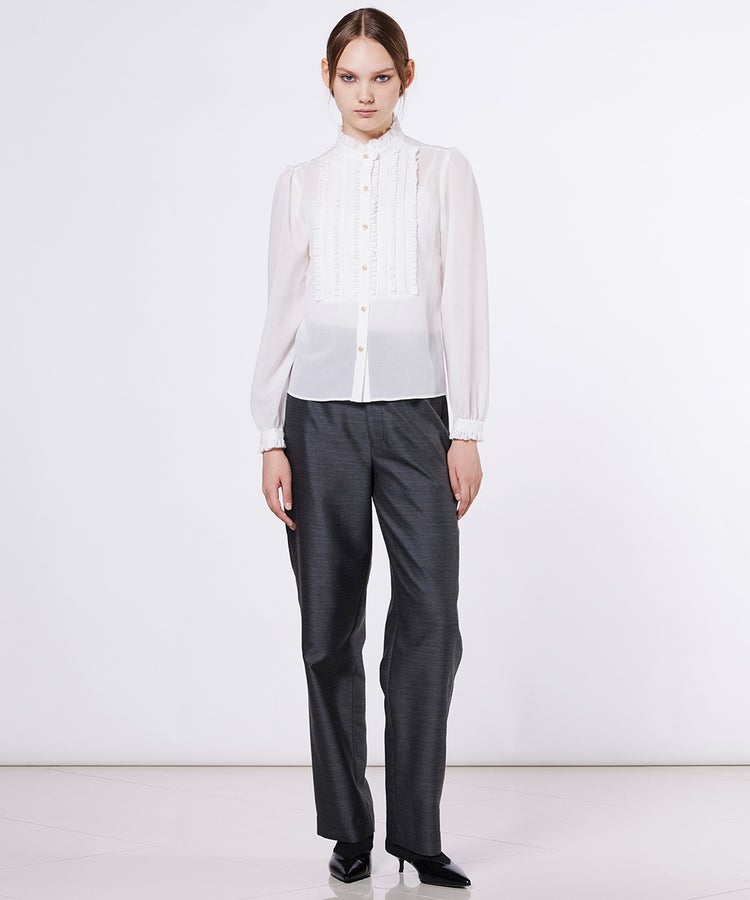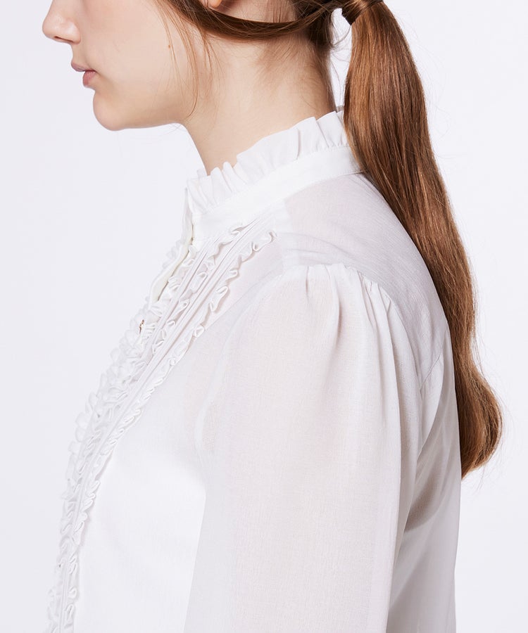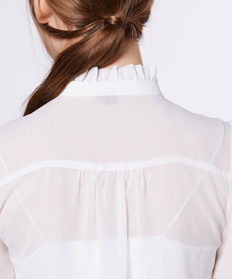 胸元の繊細なフリルが華やかさを添えるブラウス。透け感のあるシフォン素材で程よい肌見せを叶え、シフォンならではの美しい落ち感が女性らしさを引き立てます。あえてデニムのセットアップやスラックスと合わせれば、ハンサムライクな着こなしに。デイリーからオケージョンまで幅広いシーンで活躍します。
