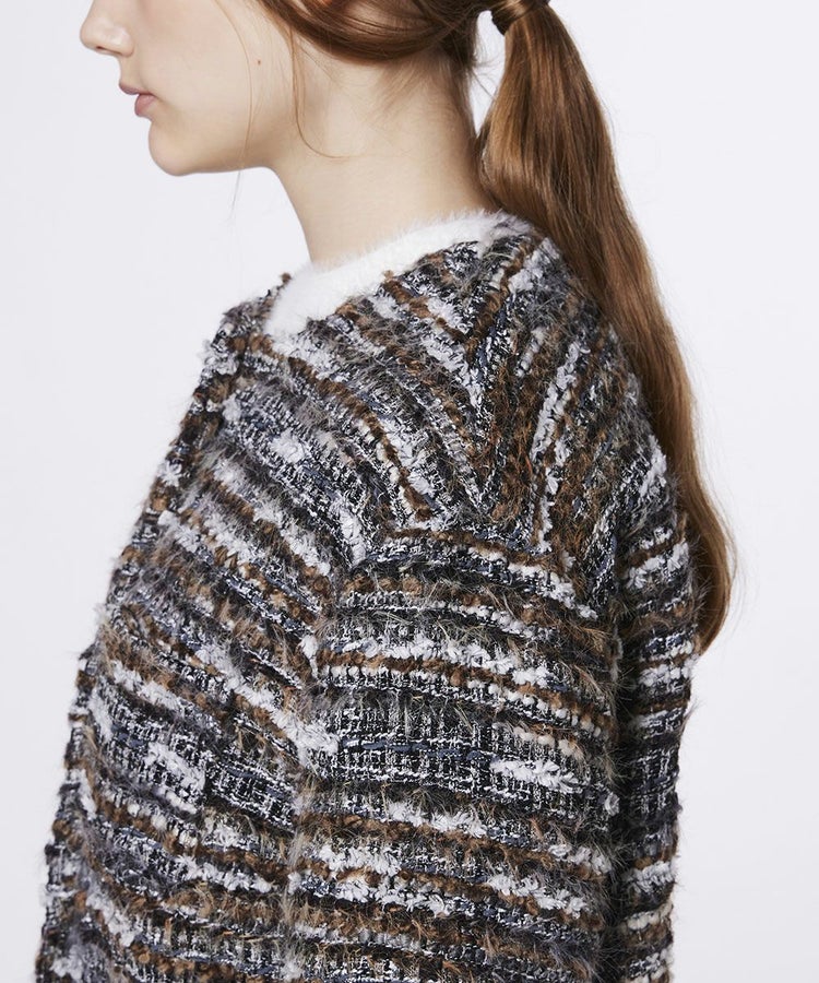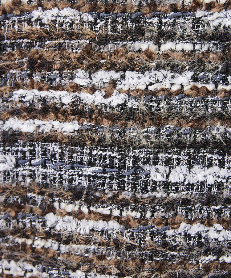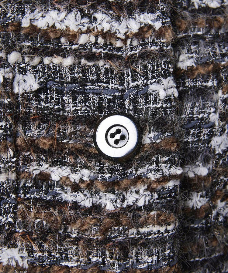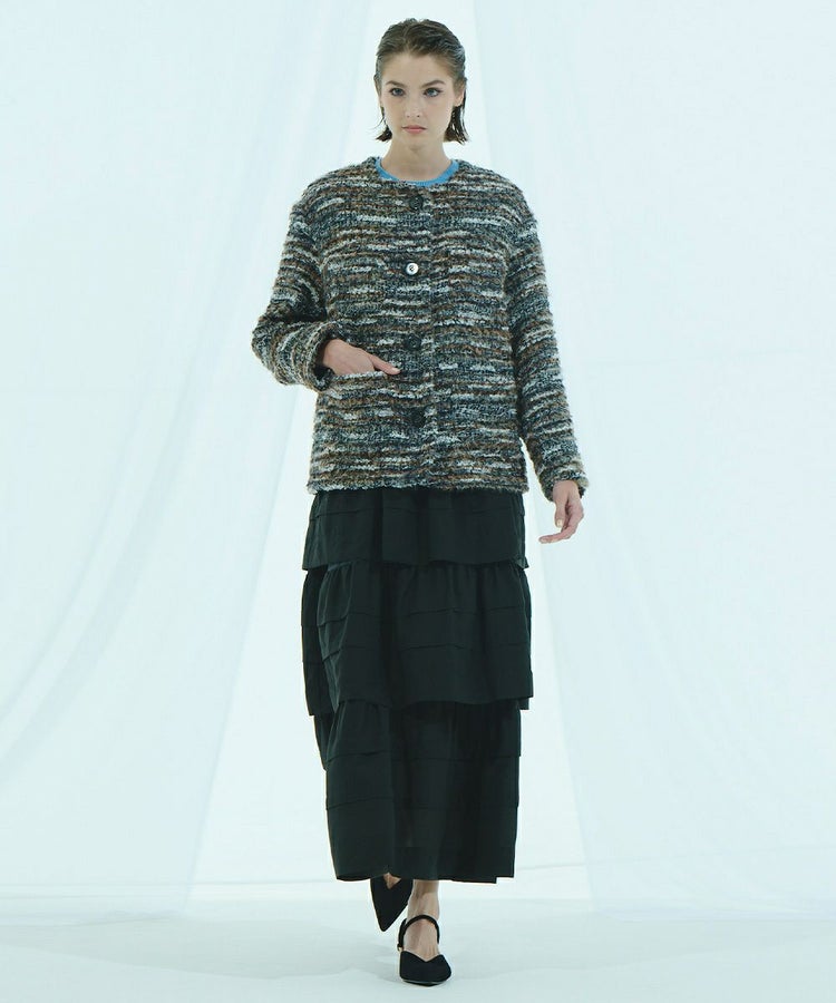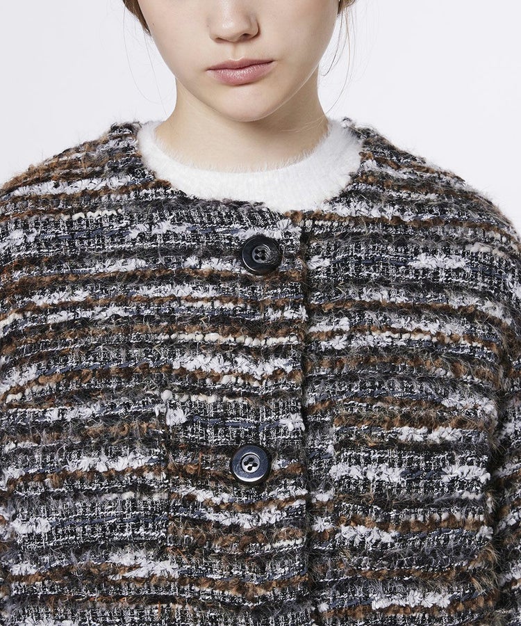 落ち着いたカラーリングがクラシカルな印象のツイードジャケット。やや長めの丈感で、腰まわりのシルエットをさりげなくカバーしてくれるのも嬉しいポイントです。、ノーカラーデザインが首まわりをすっきりと演出。ボリュームのあるロングスカートやシンプルなスラックスとも相性が良く、オフィスからオケージョンまで幅広く活躍する一着です。