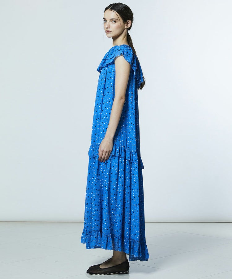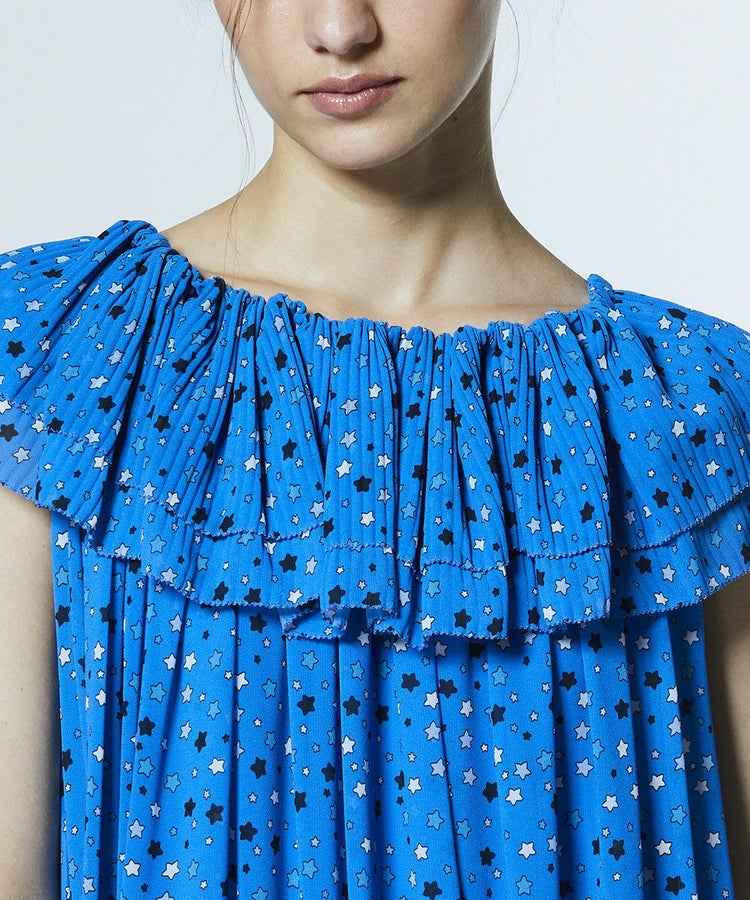 鮮やかなブルーにポップなスター柄が映える、爽やかな印象のワンピース。肩やデコルテラインを美しく見せるオフショルダー風の着こなしと、リラックス感のあるスタイルが楽しめる2WAY仕様です。裾にはフリルをあしらい、女性らしいアクセントをプラス。1枚で異なる表情を楽しめるデザインで、スタイリングの幅が広がる便利なアイテムです。