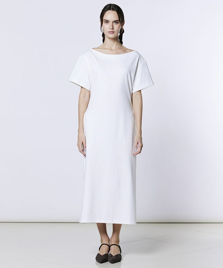 ざっくりと開いたボートネックがデコルテラインを美しく引き立て、センシュアルな大人の雰囲気を漂わせるワンピース。肉厚な素材ながらもシルエットはすっきりと美しく、カジュアルになりすぎず上品に着こなせます。ウエストには程よいくびれを持たせ、女性らしいラインを演出。背面にはスリットを施し、動きやすさと抜け感をプラスしました。