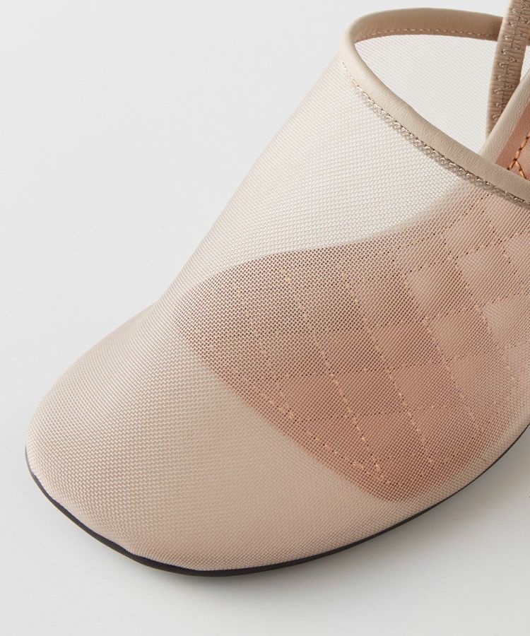 シアーなメッシュ素材で作ったミュール。春夏らしい涼しげで軽やかな足元を演出します。また、透け感があるためセンシュアルなムードもたっぷり。パンツスタイルに取り入れてメリハリを出すのがおすすめです。ヒールは高すぎないピンにすることで、美脚効果と歩きやすさを両立。サイドやバックから見た姿もきれいです。