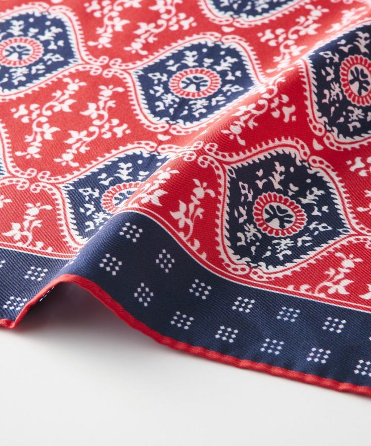シルクならではの上品な光沢が、エレガントな雰囲気を演出するスカーフ。なめらかな肌ざわりで、カジュアルな柄ながらも大人らしい洗練されたスタイルを楽しめます。レッドとブルーの2色展開。頭に巻いてトレンド感をプラスしたり、首元やバッグのアクセントとして取り入れるのもおすすめです。