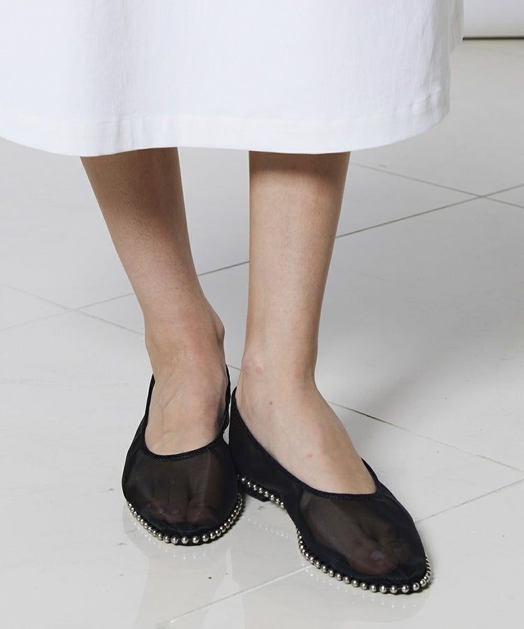 メッシュデザインが足元に程よい抜け感をプラスするパンプス。フラットタイプで、長時間履いても疲れにくい快適な履き心地が魅力です。シルバーのボールチェーンがクールなアクセントとなり、スタイリッシュな印象に。モード感がありながらも涼やかで、幅広いスタイリングに馴染む一足です。
