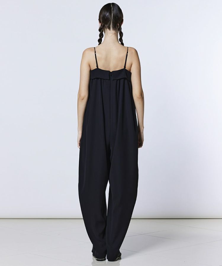 なめらかな落ち感と上品なツヤを持つツイルダブルクロス素材を使用し、シルキーで洗練された印象に仕上げたオールインワン。程よくゆとりのあるシルエットが、リラックス感のある着こなしを叶えます。キャミソール仕様でヘルシーな肌見せを演出しつつ、ほどよくセンシュアルなムードに。Tシャツを重ねたレイヤードスタイルもおすすめです。