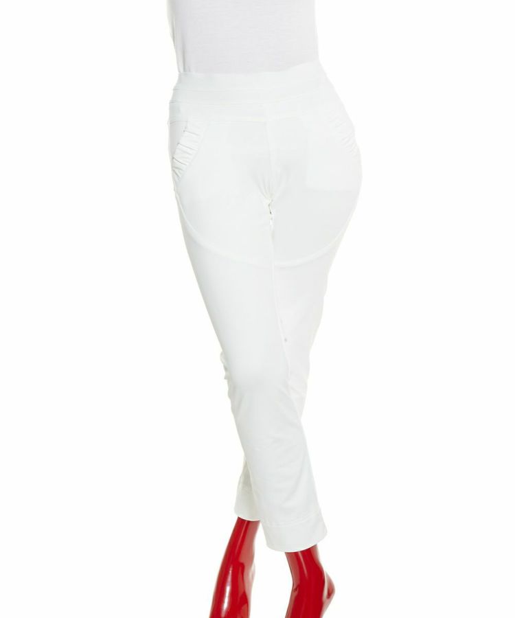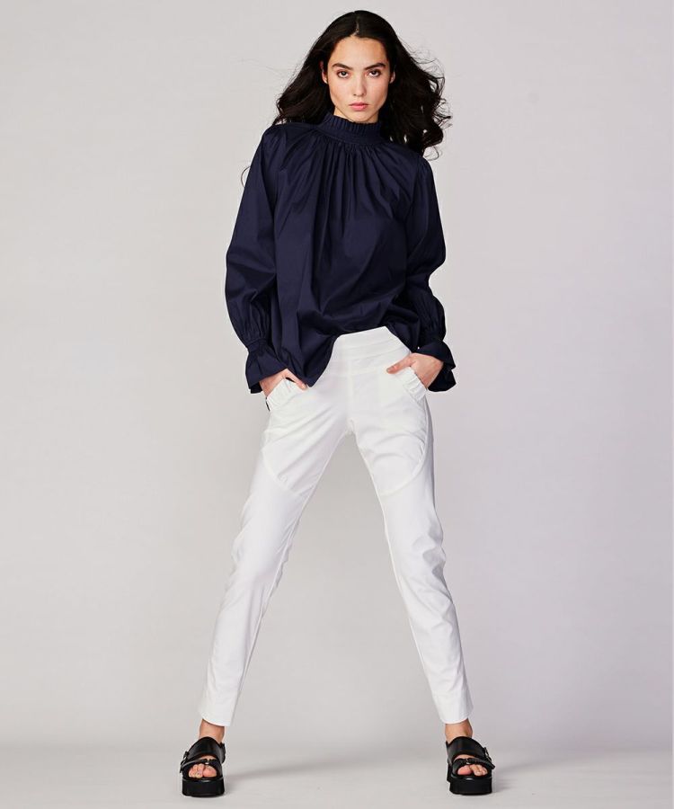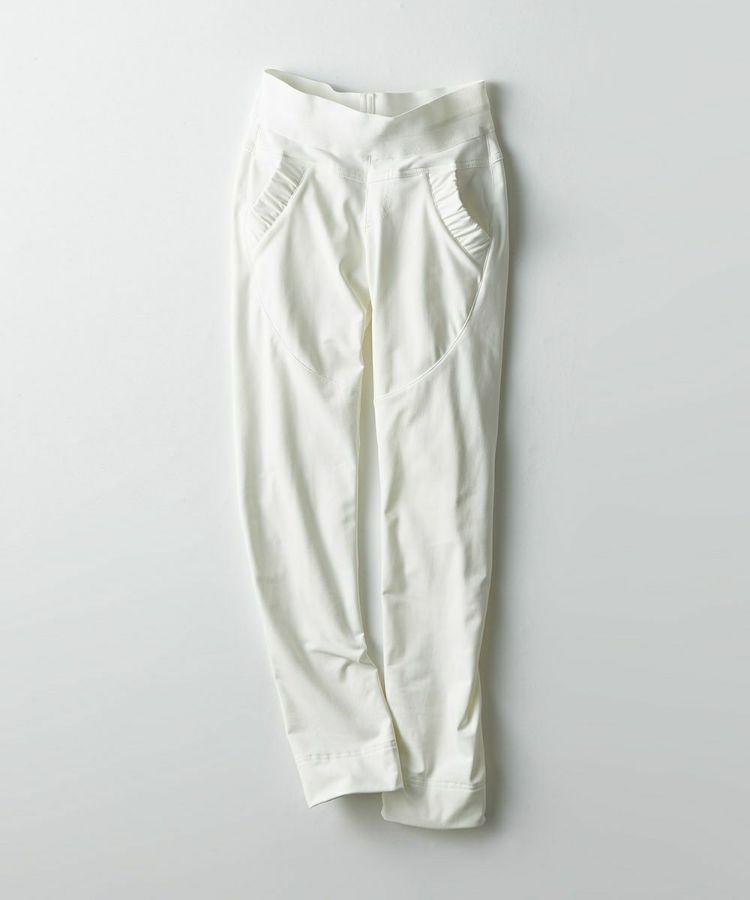 ハイテンションと名が付くとおり、優れた伸縮性を誇るSov.の定番ボトム。脚線をスマートに見せる細身シルエットでありながら、履き心地はノーストレスで快適。アンクル丈も足首を華奢に映す絶妙なバランスです。ウエストはノーストレスなゴム仕様ですが、ギャザーを寄せないフラットデザインなので穿いたときの表情がきれい。