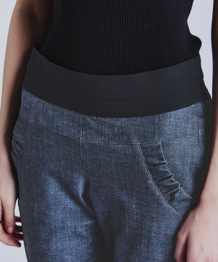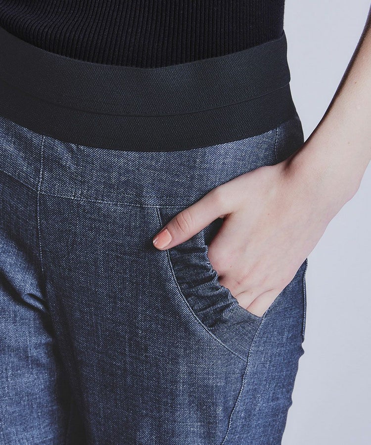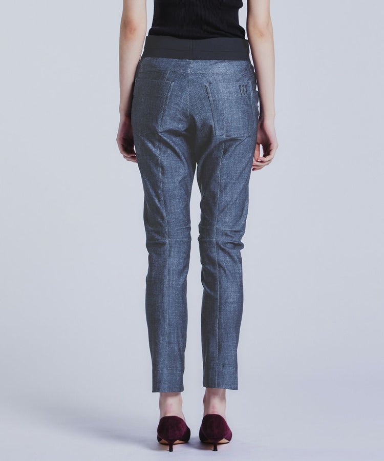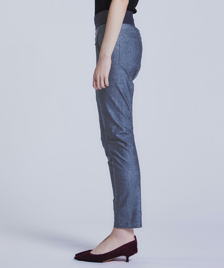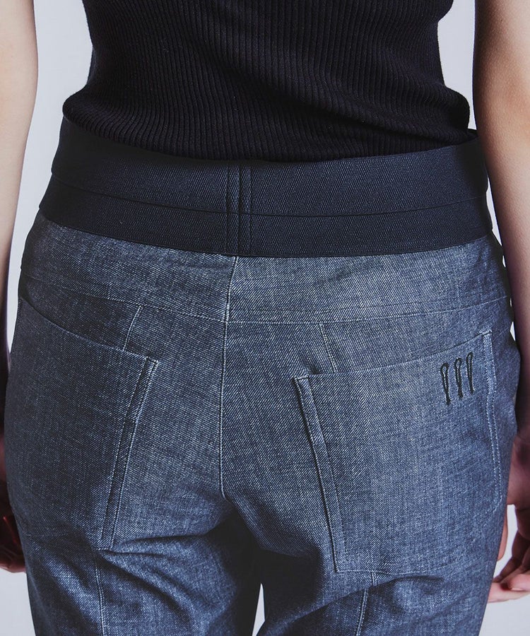 ダブスタ定番人気のメリル素材を使用したパンツシリーズより、味わい深いインディゴデニムライクな新色が登場。ニットやアウターなど、トップスにボリュームのある着こなしをすっきりとスタイリッシュにまとめてくれる細身のシルエットです。モードな切り替えと計算された美脚パターンで、着映えと体型カバーを両立。ウエストには幅広ゴムを採用しているため、伸びやかな素材で動きやすく、ストレスの少ない着心地。きちんと感とカジュアルさを兼ね備えた一本です。