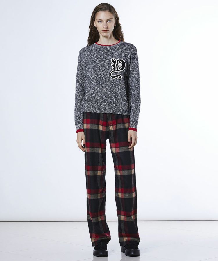 胸元にあしらったダブスタの“D”文字ワッペンがアクセントになったニット。上品な光沢感と手触りの良いスラブヤーン素材を使用し、ゆったりとしたシルエットでさりげなく体型をカバーしてくれます。首元にはレッドの差し色を添えて、さりげないポイントに。1枚での着用はもちろん、シャツとのレイヤードスタイルにもおすすめです。