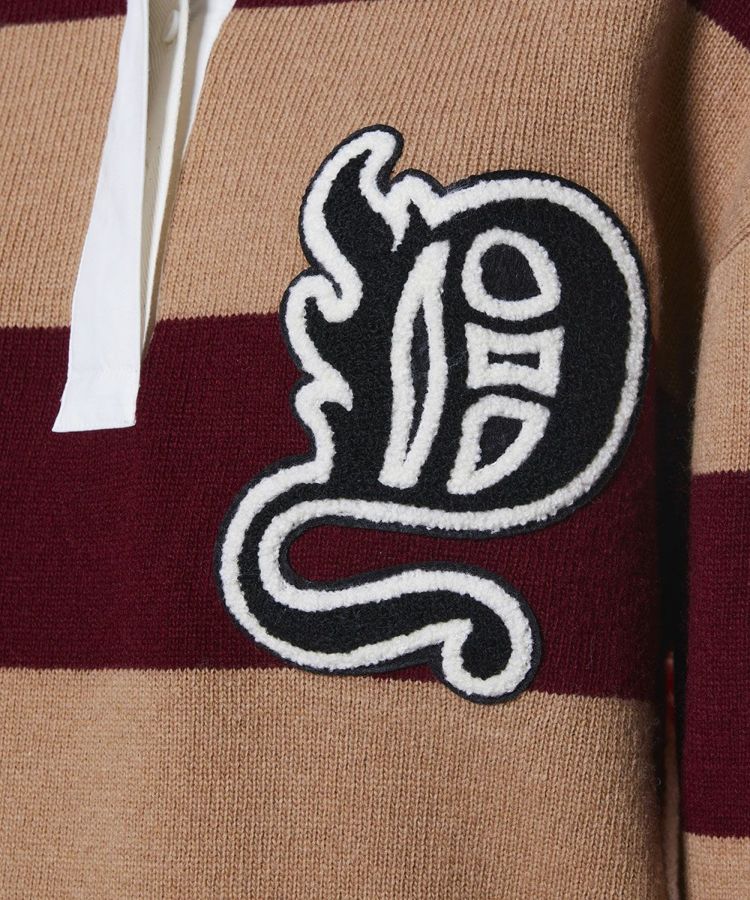 フロントはラガーシャツ風、バックはホワイト×レッドのボーダーニットと、異なるデザインをドッキングさせた個性的なニット。前後で違った表情を楽しめるユニークなデザインが魅力です。胸元には“D”のロゴをあしらい、さりげなくアクセントをプラス。デニムやロングスカートと合わせるだけで、大人カジュアルなスタイリングが完成する万能アイテムです。