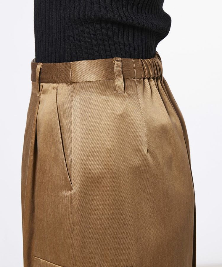上品な光沢感と美しいドレープを併せ持つキュプラ素材を使用したスカート。センターに大胆なスリットを施すことで、歩きやすさとセンシュアルな印象を同時に実現しました。ウエストのバック部分にはゴムを入れ、快適な履き心地も確保。両サイドのビッグポケットがデザインのアクセントになり、大人カジュアルに着こなせるアイテムです。