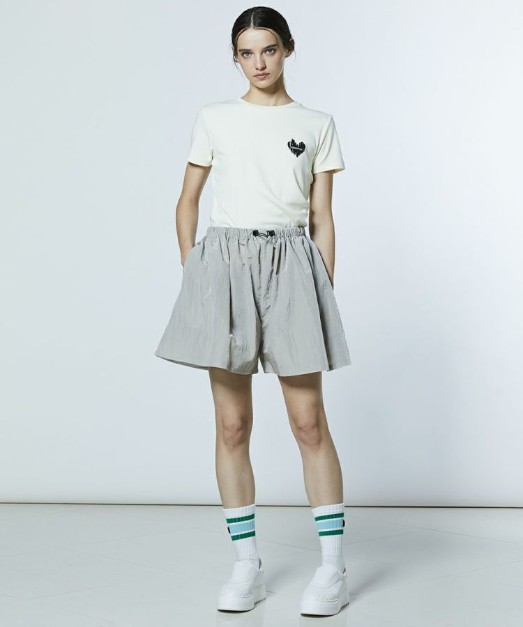 ボリュームのあるフレアシルエットが、フェミニンな印象を演出するキュロットパンツ。ハリと光沢を備えたタフタ素材にワッシャー加工を施し、奥行きのある表情に仕上げました。ウエストはゴム仕様で、動きやすく快適な穿き心地も魅力。パーカーやTシャツなどスポーティーなアイテムとも好相性で、アクティブなシーンにも活躍する一着です。