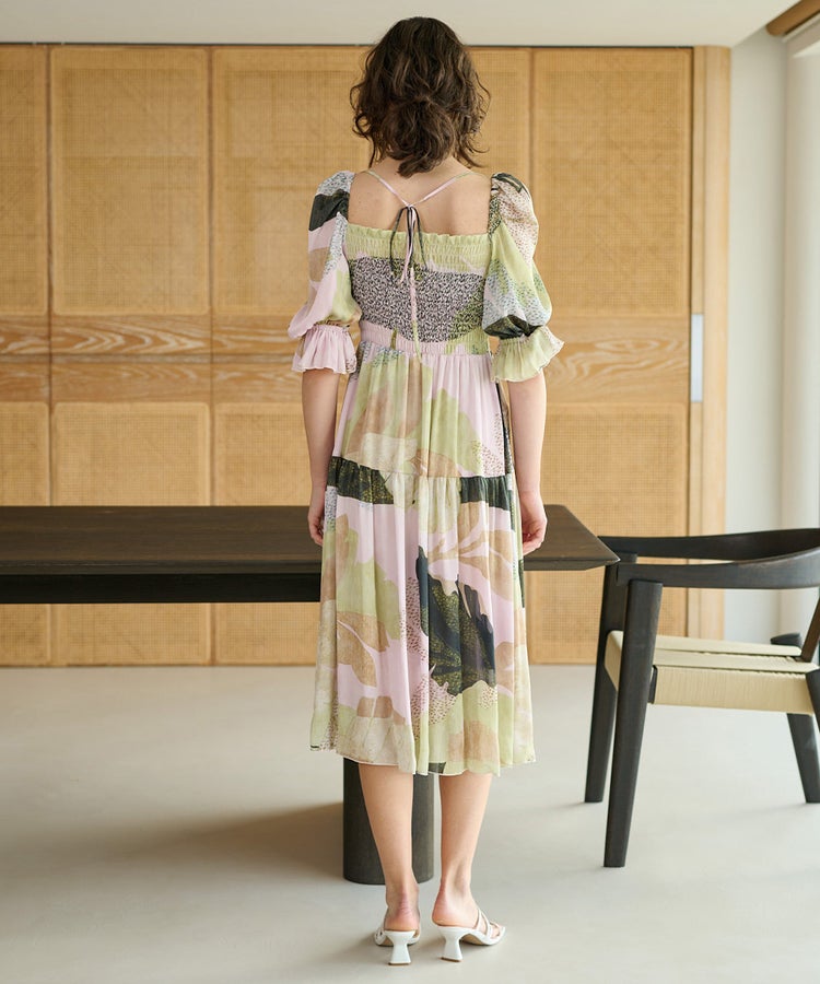 スクエアネックがデコルテラインを美しく見せて自然な華奢見えを叶えるワンピース。胸元にはたっぷりとシャーリングを施し、身体にやさしくフィットしながら、上品な甘さを添えています。柄は、リゾートムード漂うモンステラ柄と、シックな可愛らしさを楽しめるブラック×ゲルニカの2種類を用意。バックスタイルには細リボンをあしらい、後ろ姿まで印象に残る一枚に仕上げました。