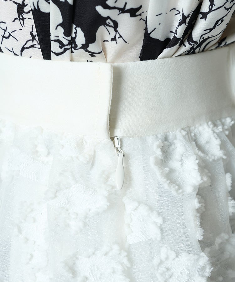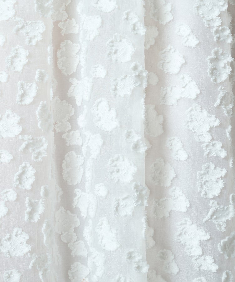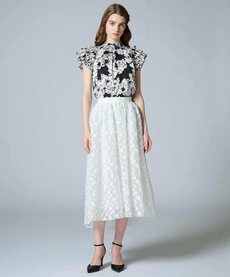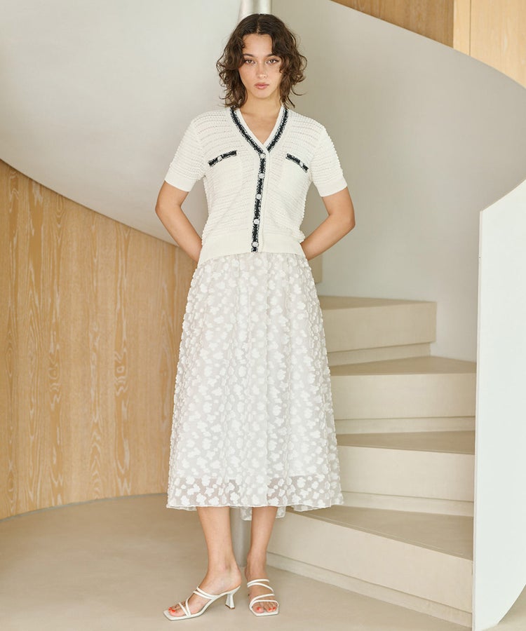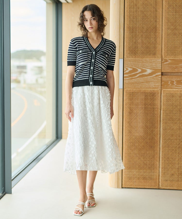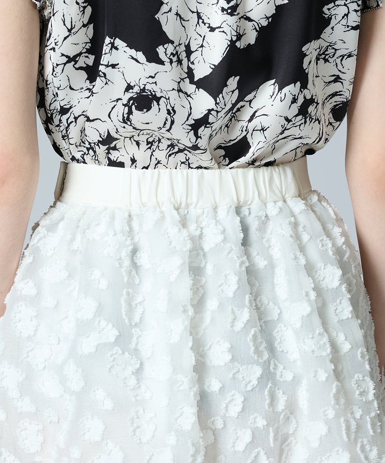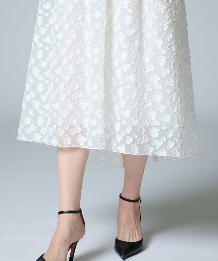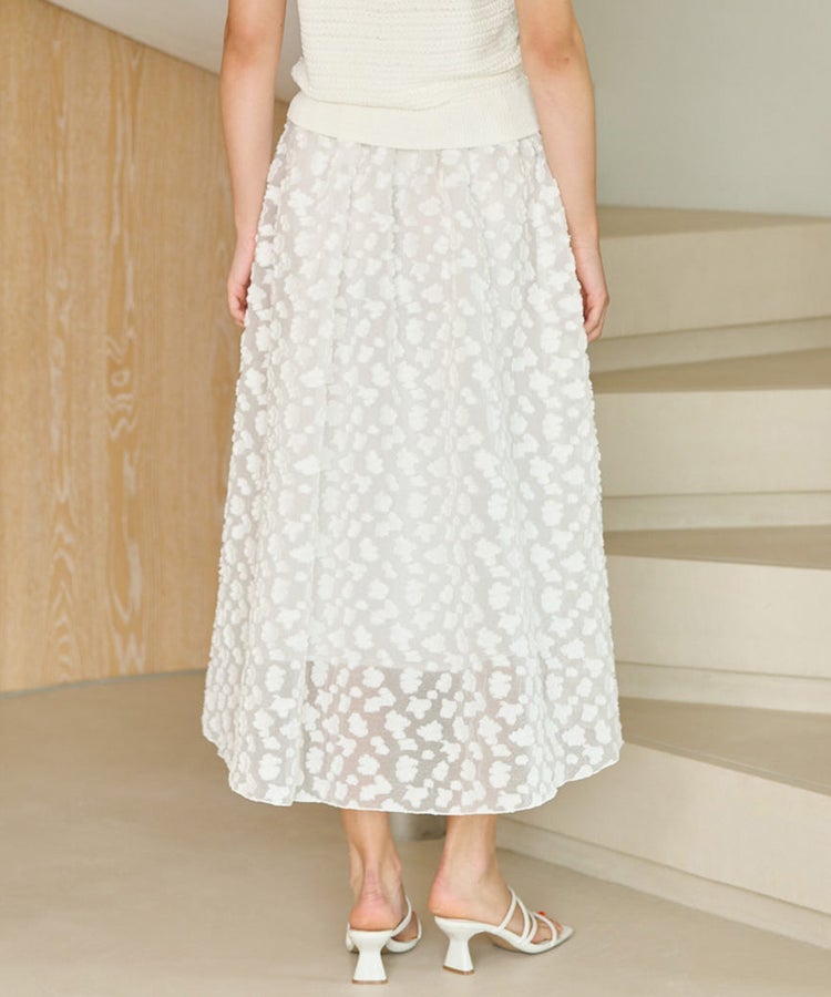 ほどよいフレア感と透け感が、フェミニンさを演出するスカート。全面にフラワーモチーフのジャガードを施し、さりげない立体感とデザイン性をプラスしました。ひざ丈のシルエットがきちんと感のある上品な印象に。シンプルなデザインは、トップスを選ばず幅広いスタイルに活躍します。