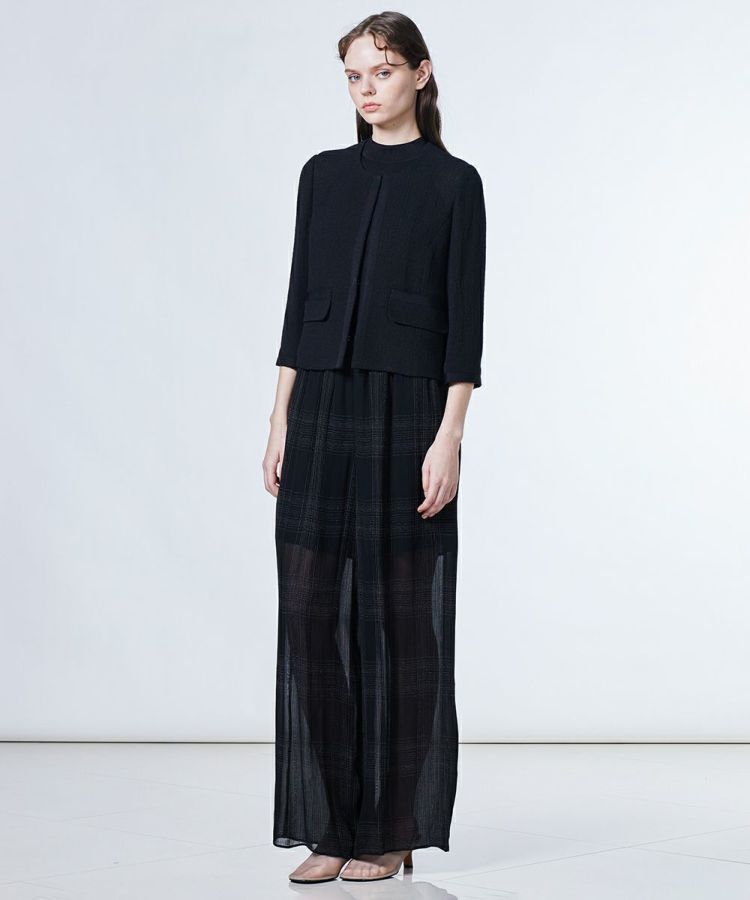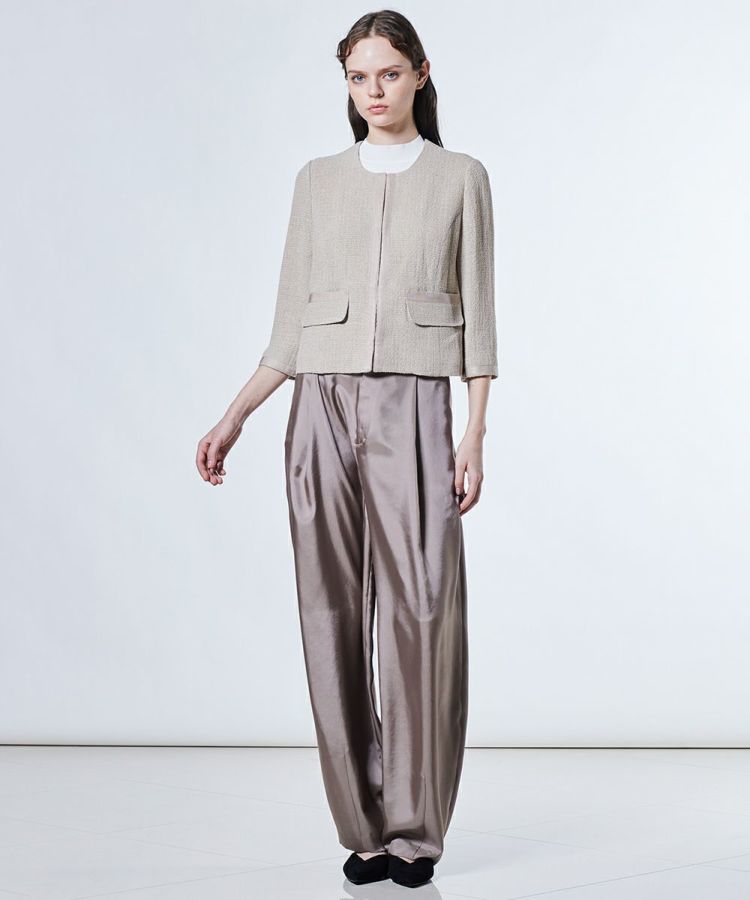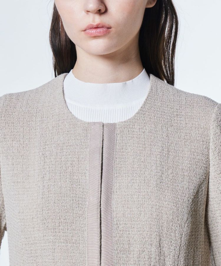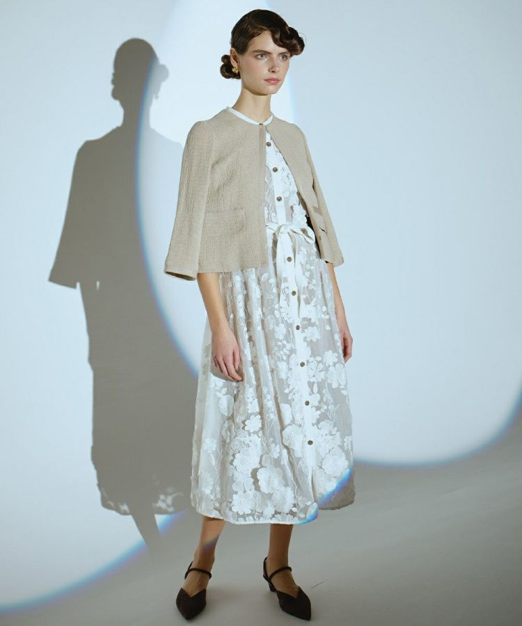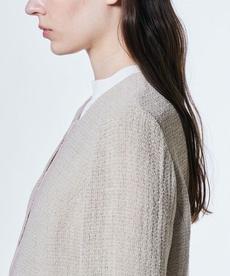 太番手の麻ラミーを使用し、軽やかでドライタッチな着心地が魅力のジャケット。通気性がよく、暑い季節でも快適に羽織れる一着です。首元をすっきりと見せるノーカラーデザインで、抜け感のある印象に。シンプルなデザインだからこそ、ワンピースやフレアスカートとの相性も抜群で、オケージョンシーンにもぴったりです。