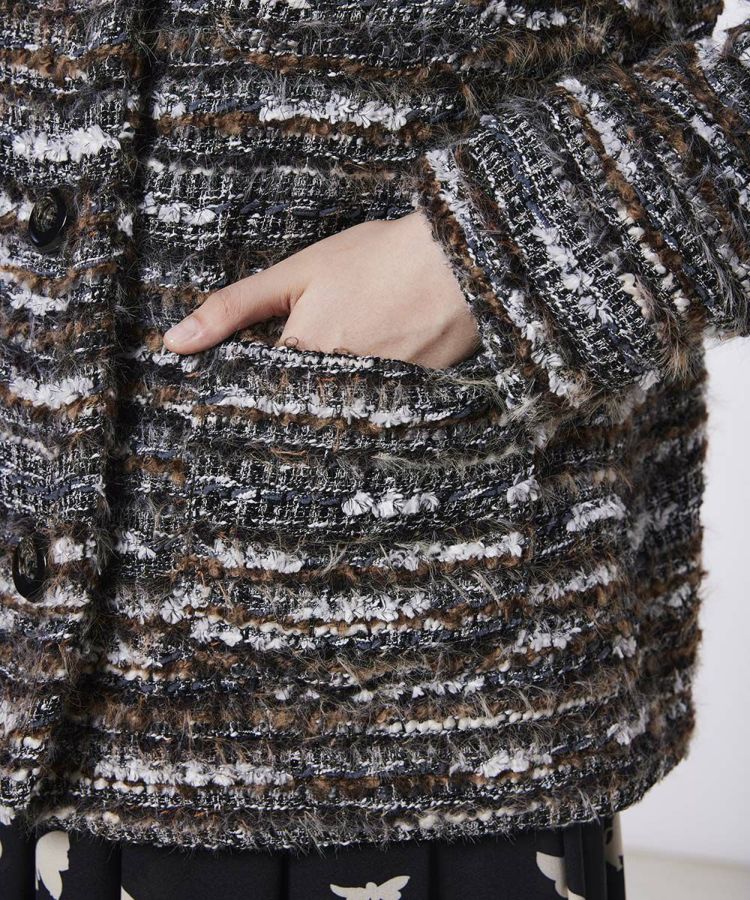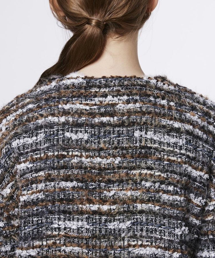 落ち着いたカラーリングがクラシカルな印象のツイードジャケット。やや長めの丈感で、腰まわりのシルエットをさりげなくカバーしてくれるのも嬉しいポイントです。、ノーカラーデザインが首まわりをすっきりと演出。ボリュームのあるロングスカートやシンプルなスラックスとも相性が良く、オフィスからオケージョンまで幅広く活躍する一着です。